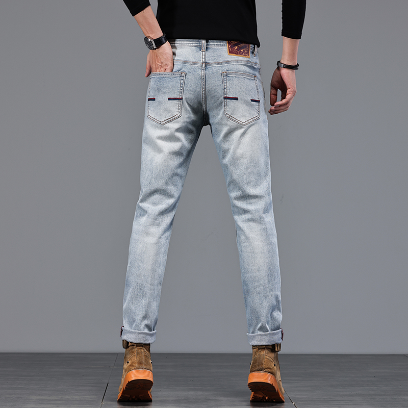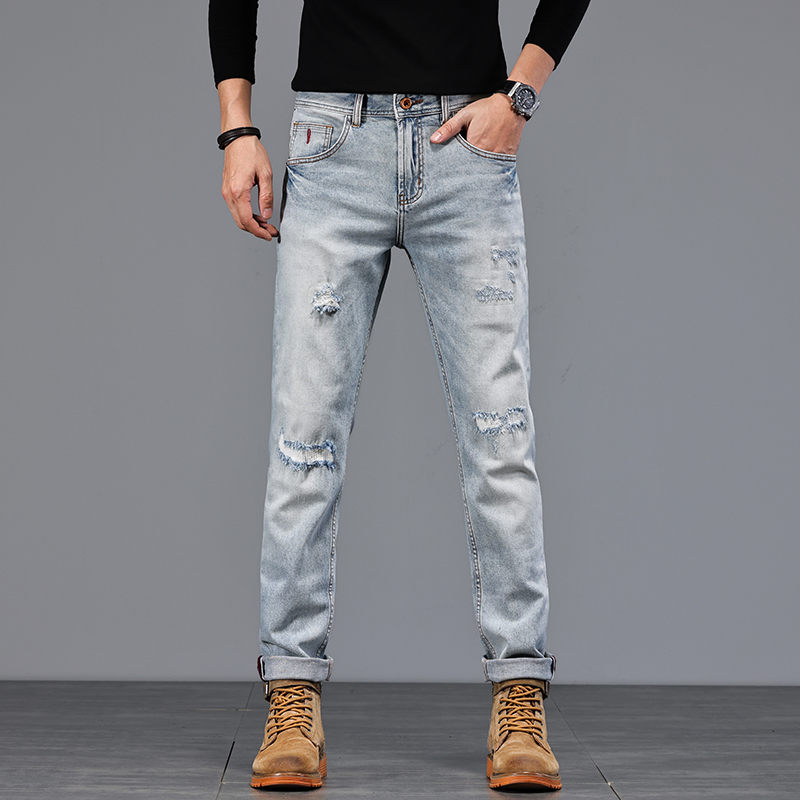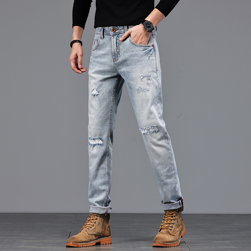 浅蓝色 男生2025年春夏季 新款 高端轻奢休闲显瘦潮流破洞合体牛仔裤