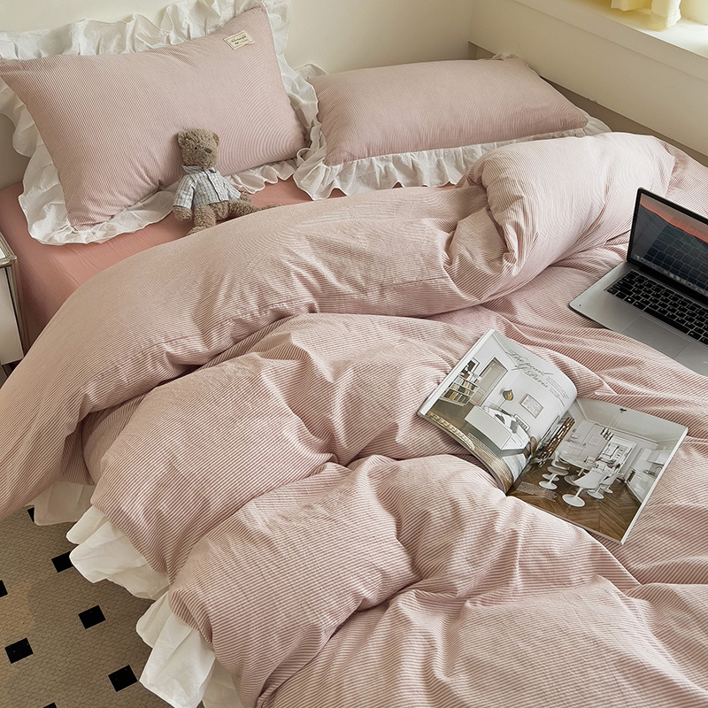 全棉色织水洗棉四件套公主风荷叶花边卧室简约条纹1.8米
