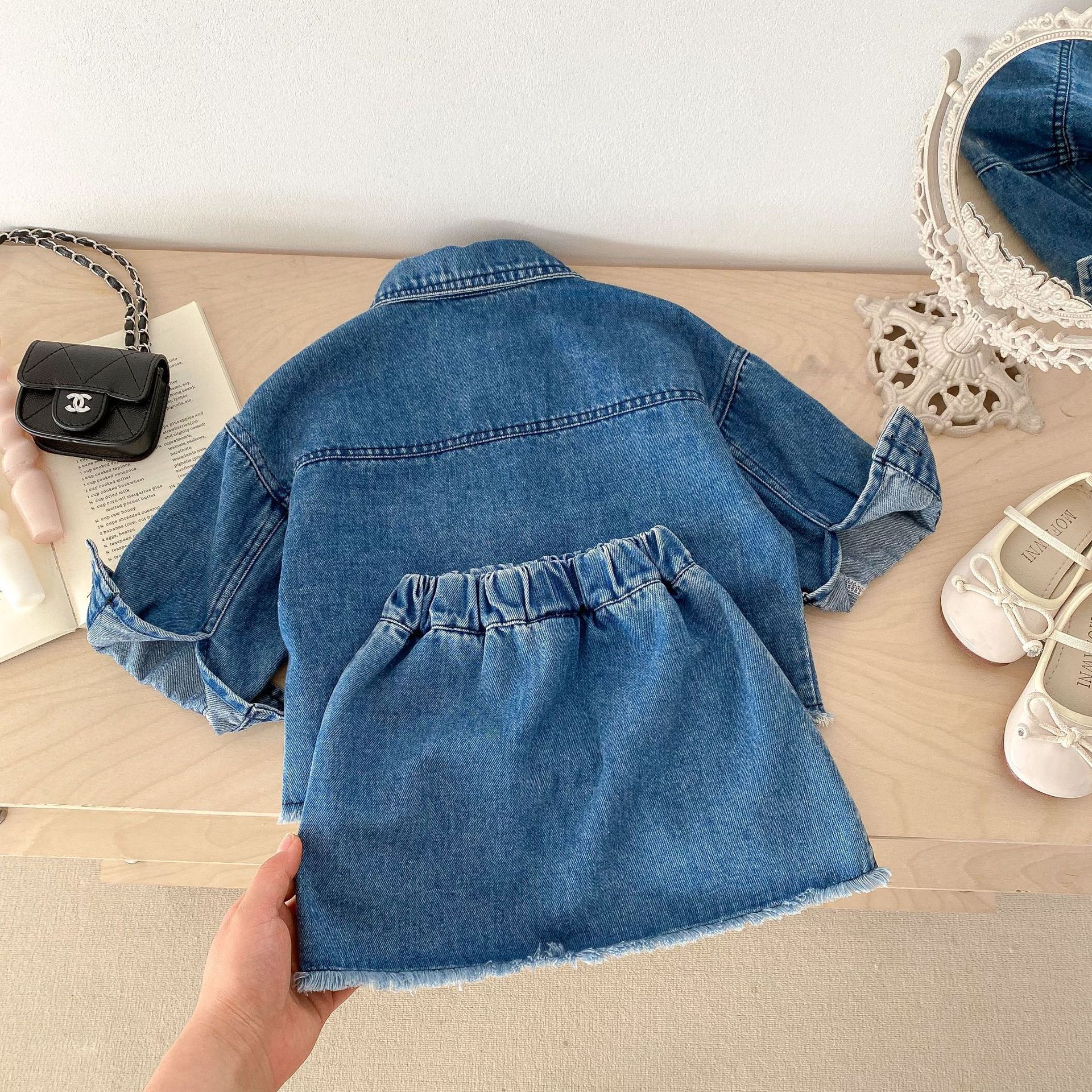 短款 女童复古牛仔套装 女宝宝韩版 5岁春季 牛仔服短裙两件套