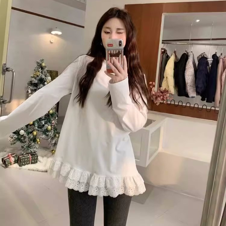 宽松显瘦内搭上衣打底衫 春秋季 设计感别致蕾丝花边白色t恤女长袖