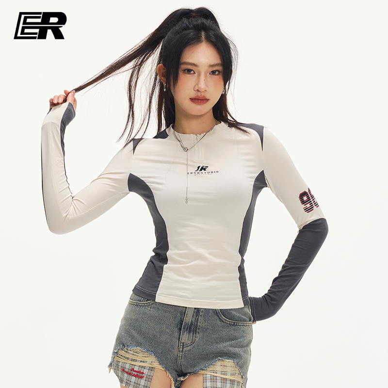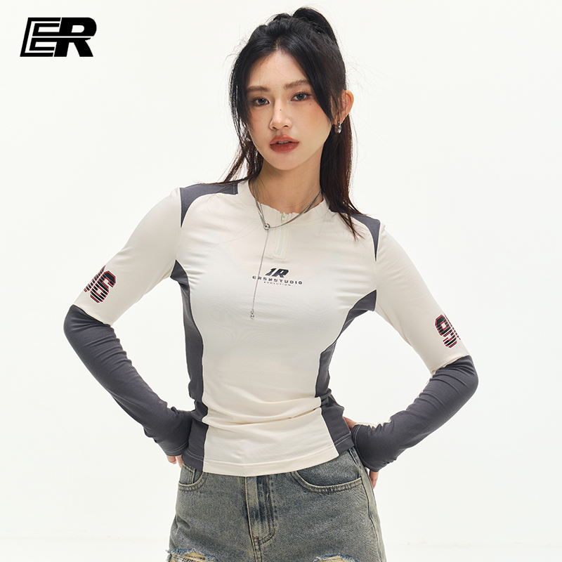ER撞色拼接长袖 莱赛尔2025夏潮牌 印花运动T恤骑行服女高级感修身
