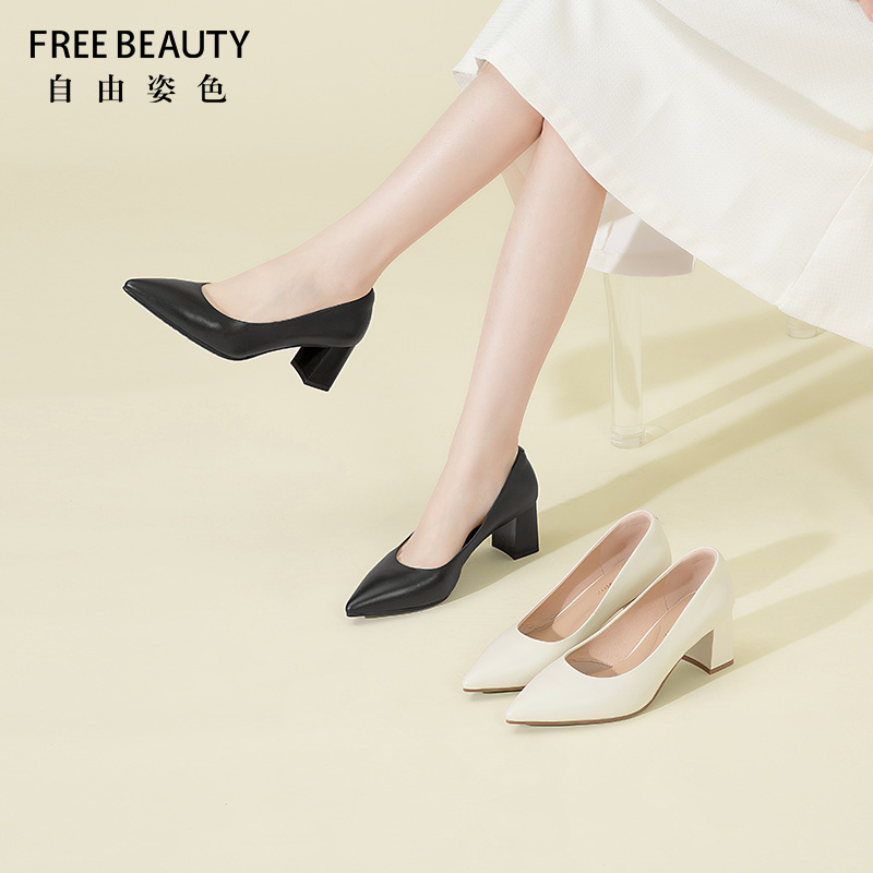 尖头粗跟单鞋 自由姿色春秋新款 纯色简约百搭真皮通勤工作职业鞋