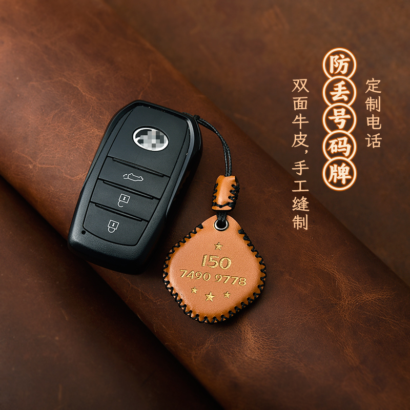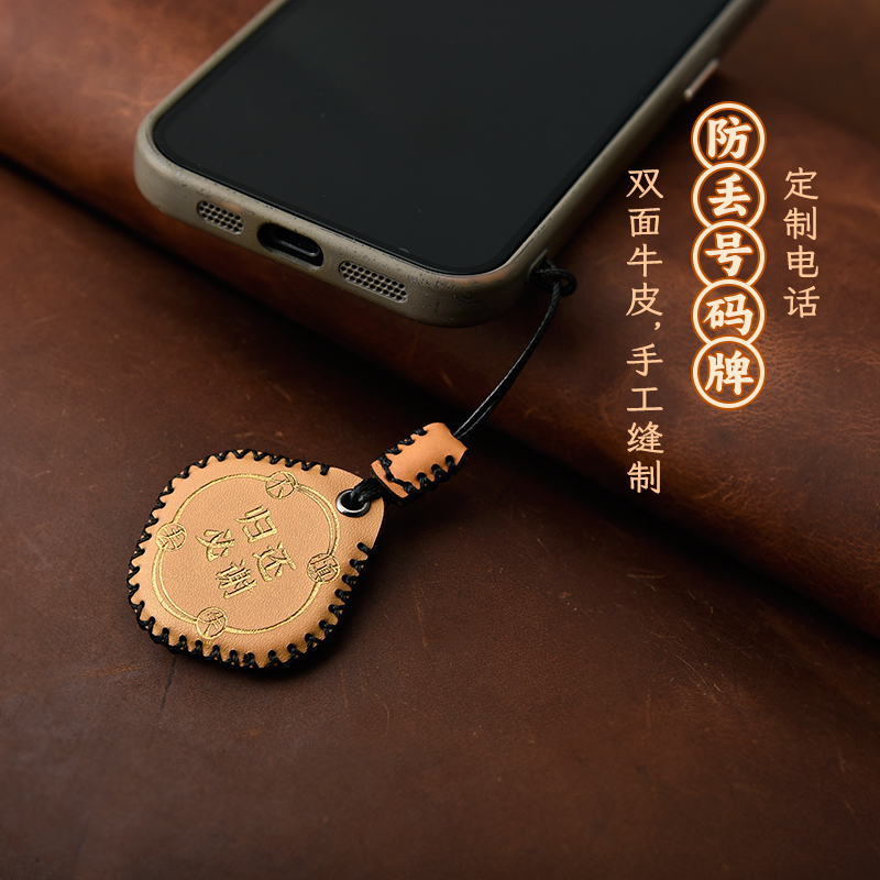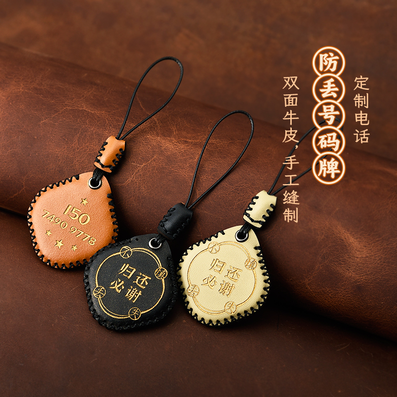 若谷匠人防丢电话号码 牌车钥匙扣挂件牛皮刻字定制手机挂绳挂饰链