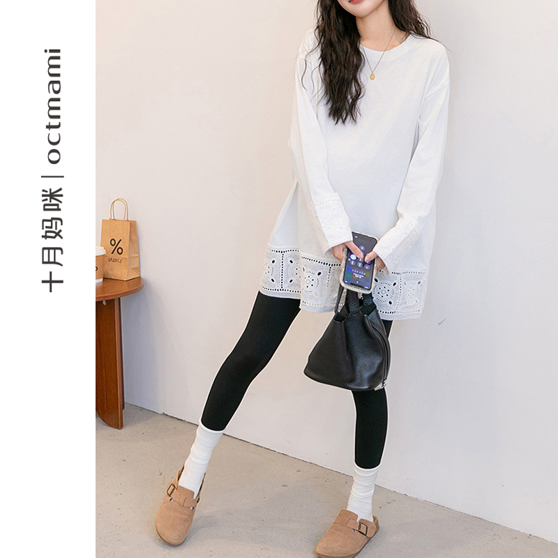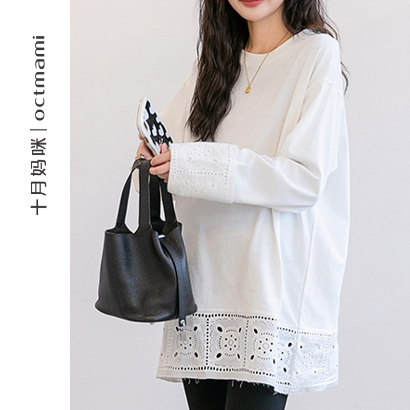 口蕾丝宽松遮肚上衣秋装 圆领下摆袖 T恤2025新款 十月妈咪孕妇长袖