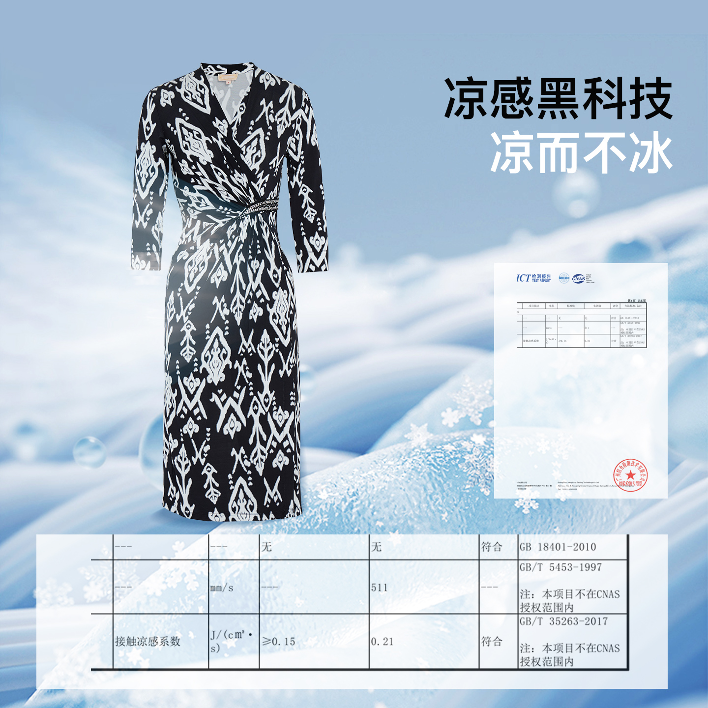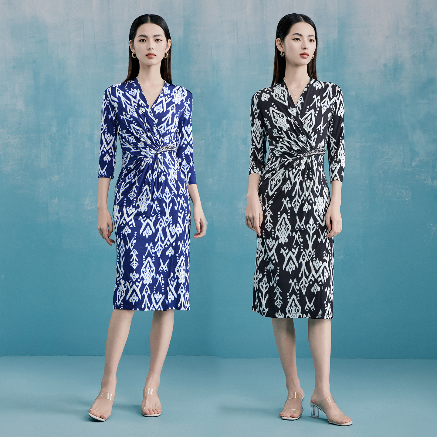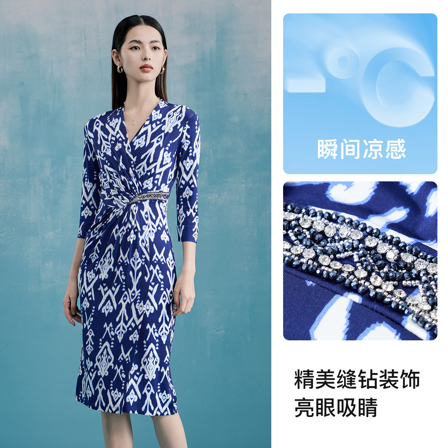 马天奴女宝蓝色印花V领收腰连衣裙凉感气质裙子春夏新款 流行 时尚