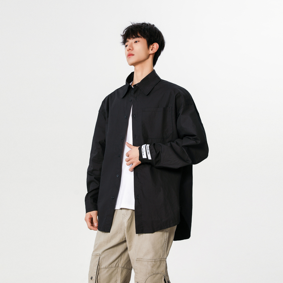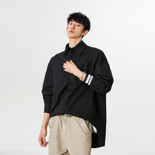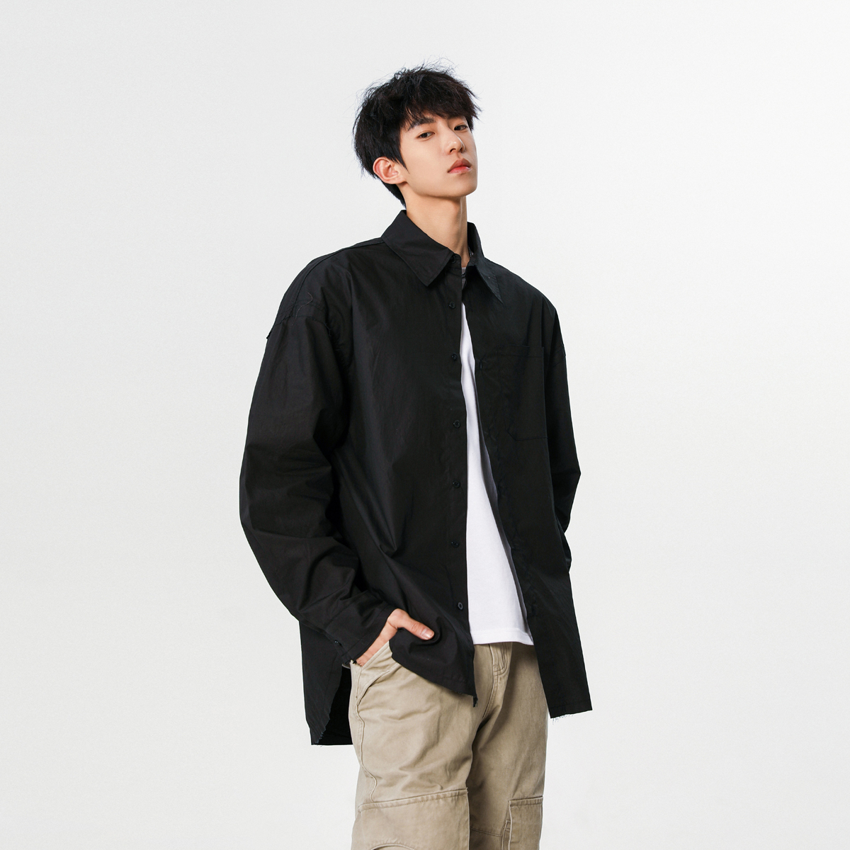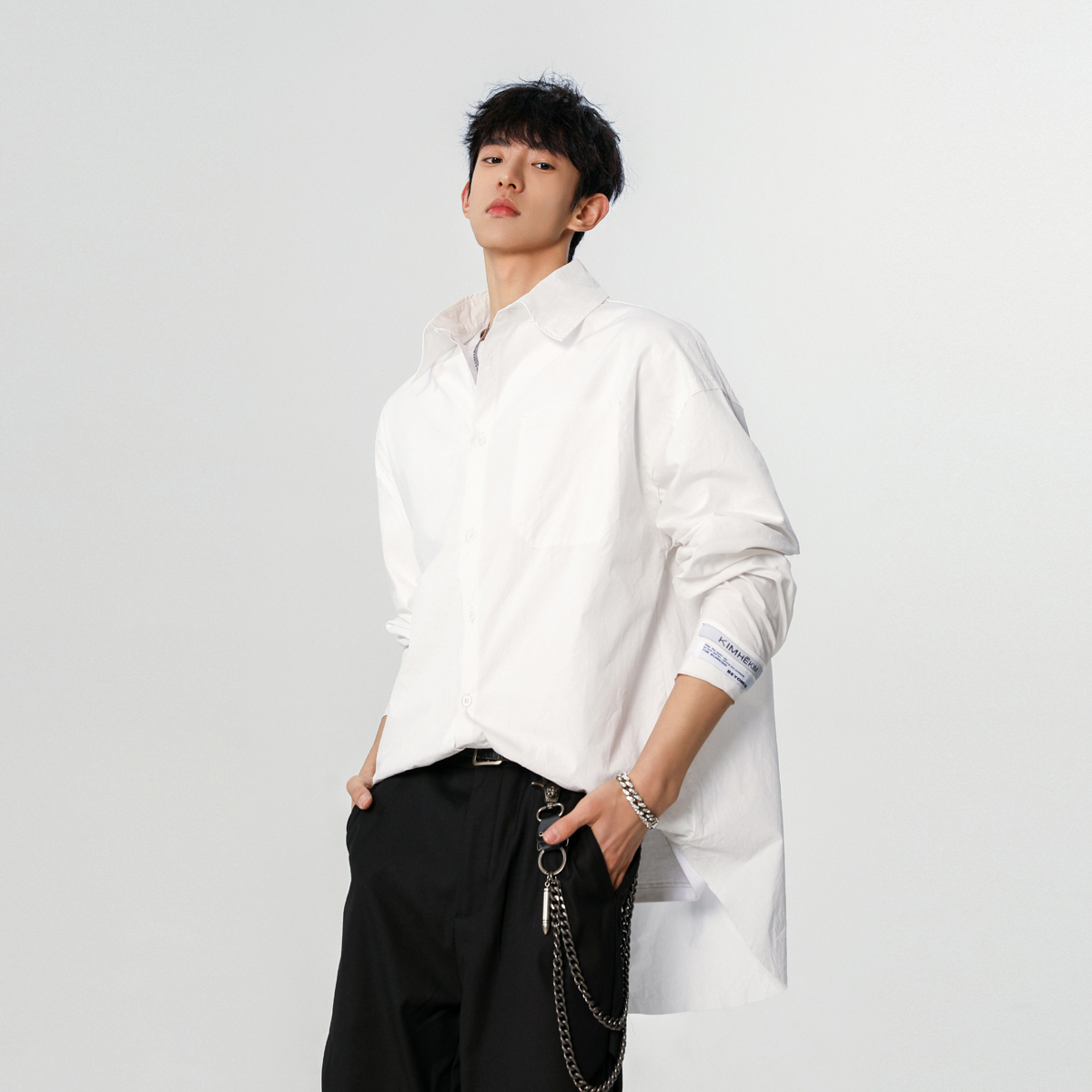 设计款 男2025春秋新款 贴标毛边痞帅宽松休闲衬衣外套 衬衫 白色长袖
