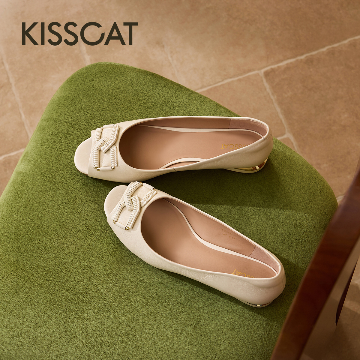 白色凉鞋 KISSCAT接吻猫25新款 气质法式 真皮鱼嘴鞋 低跟平底鞋