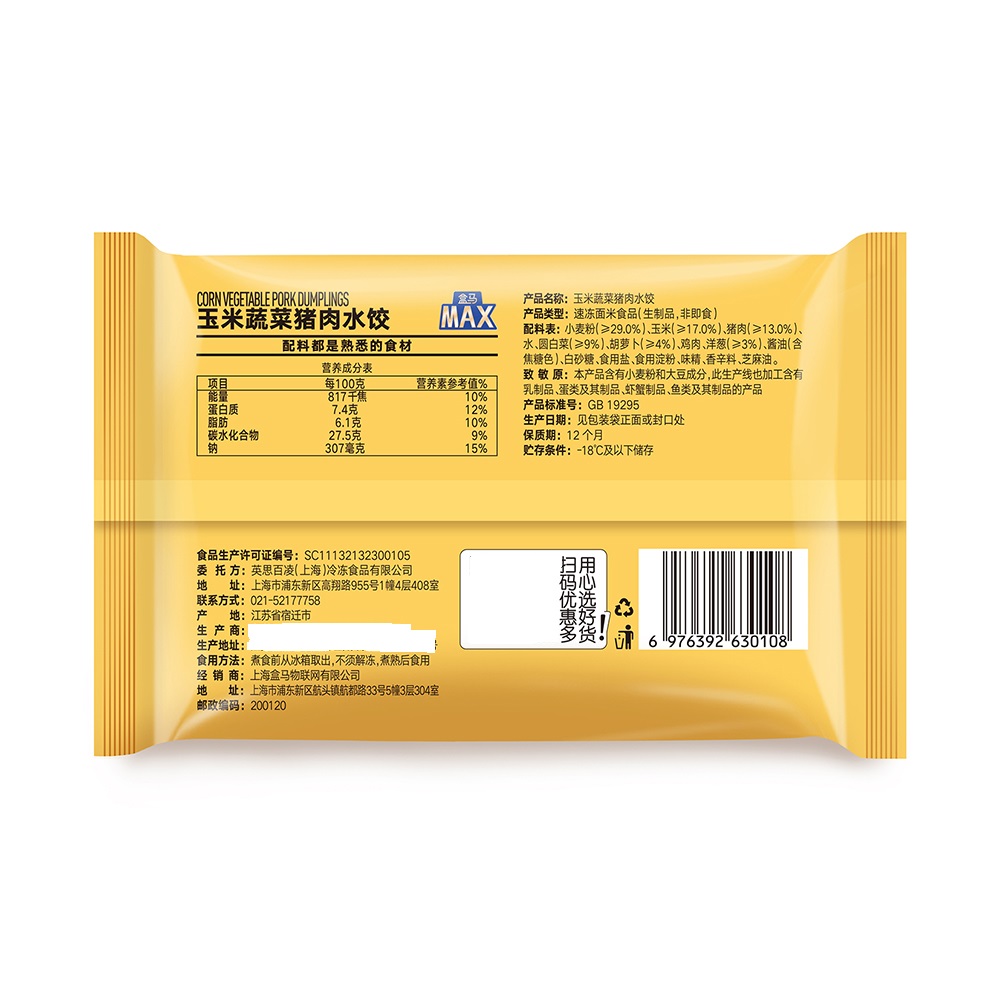 99只 2kg 玉米蔬菜猪肉水饺 盒马MAX