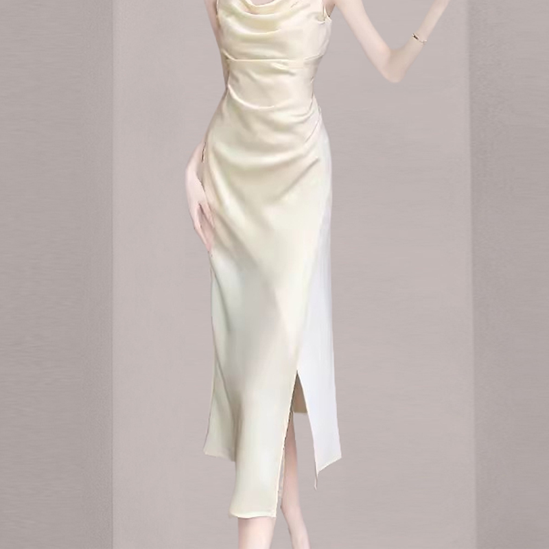 包臀裙 钉珠开叉气质连衣裙收腰修身 法式 荡领醋酸缎面吊带裙女夏季