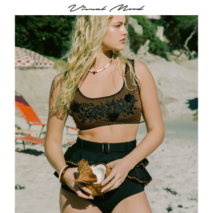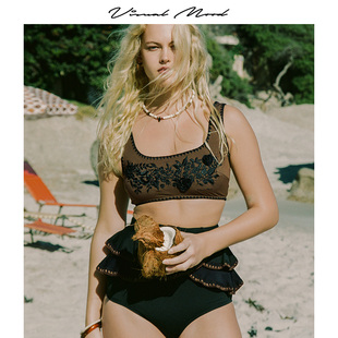 visual mood分体泳衣复古棕黑盘花刺绣高低腰显瘦度假比基尼套装