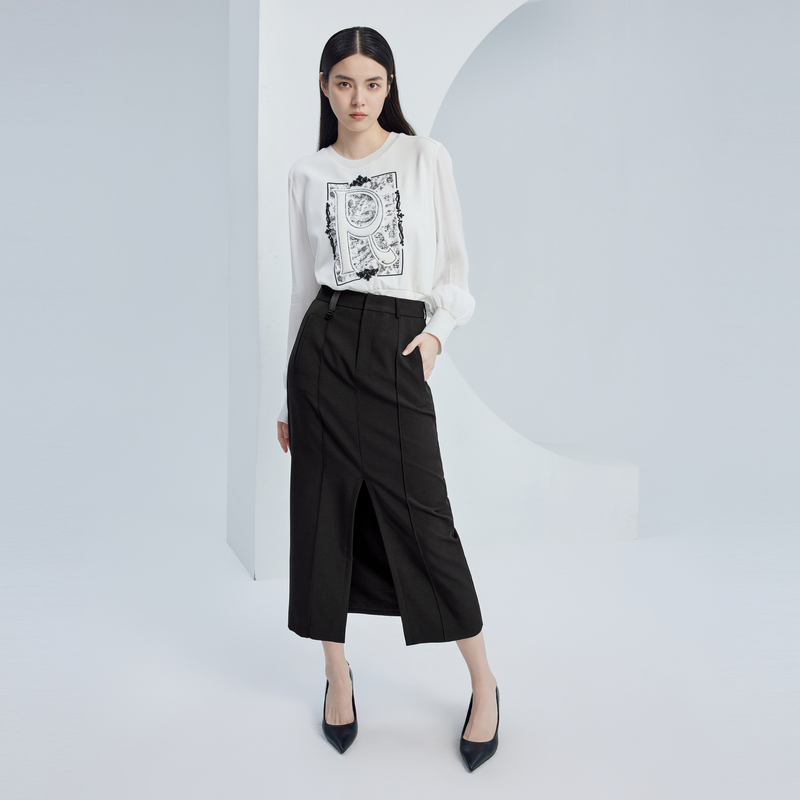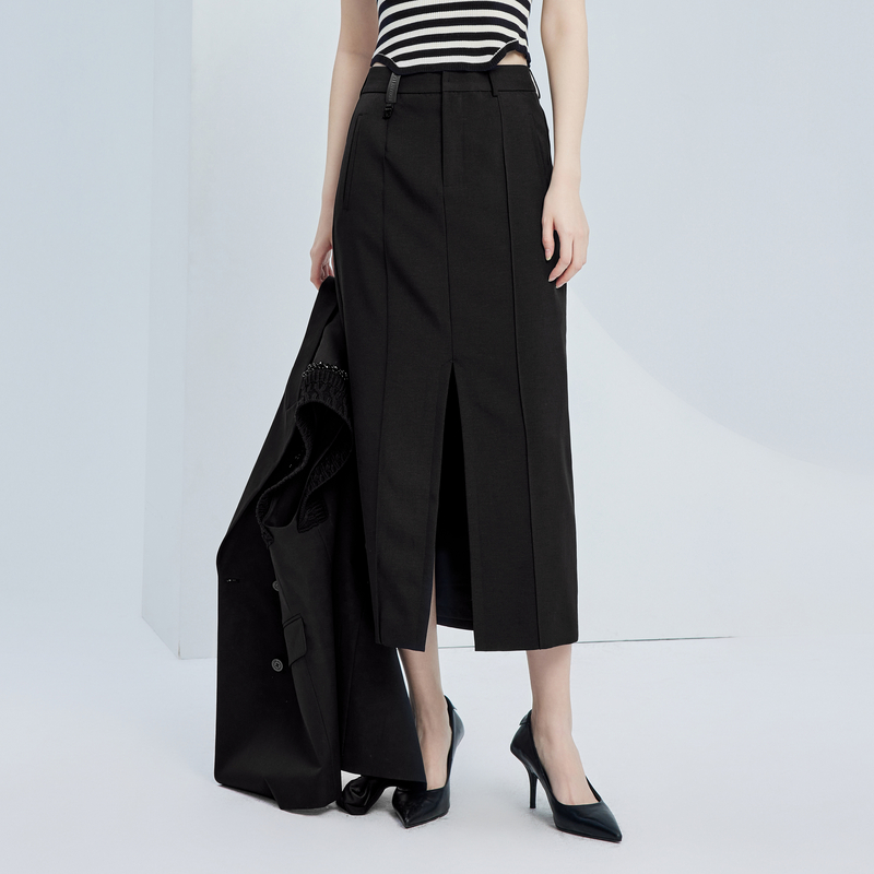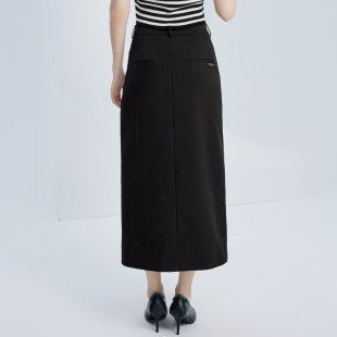 新款 秋季 字母标签设计直筒裙女 半身裙时尚 XG雪歌黑色通勤开叉个性