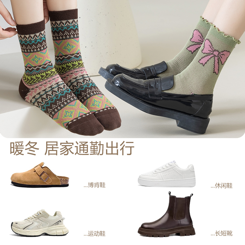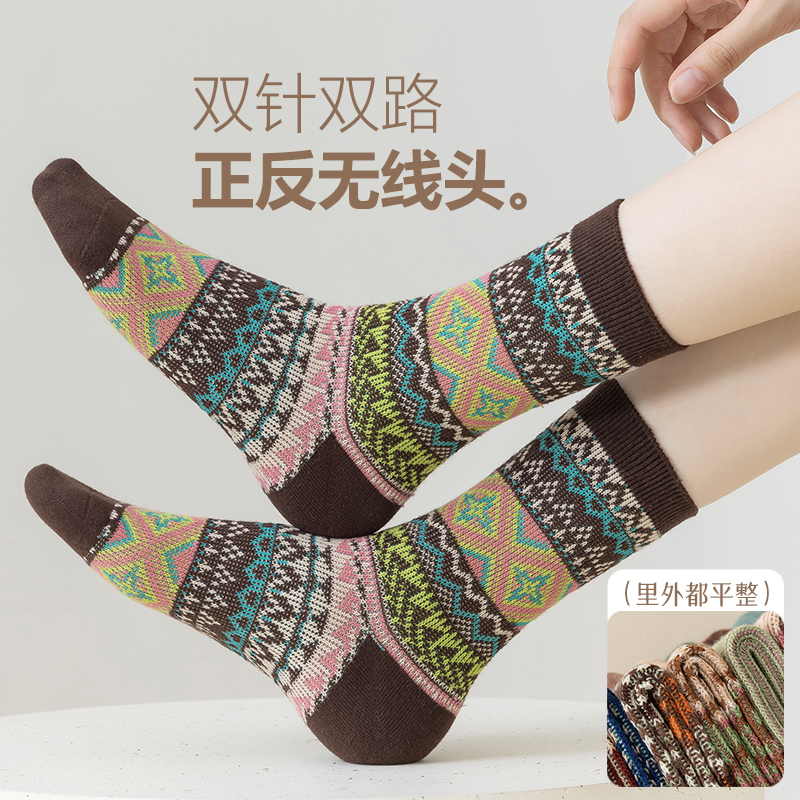 撞色复古袜子女中筒袜春秋冬季 纯棉纱线秋民族风防臭加厚潮流长袜
