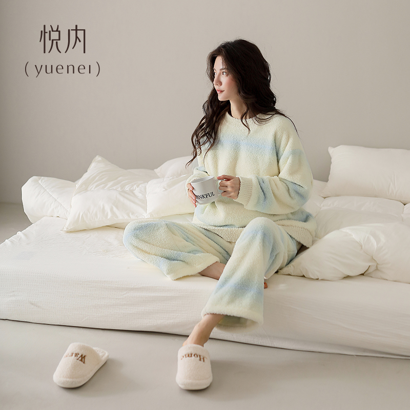 悦内半边绒睡衣女秋冬季 珊瑚绒加绒保暖家居服圆领套头软绵绵 冬款