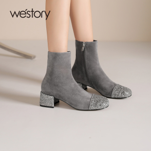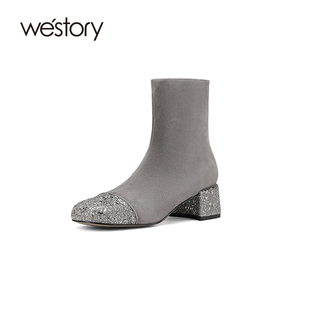 气质粗跟高跟瘦瘦靴弹力短靴小个子 法式 westory2025年冬季 新款