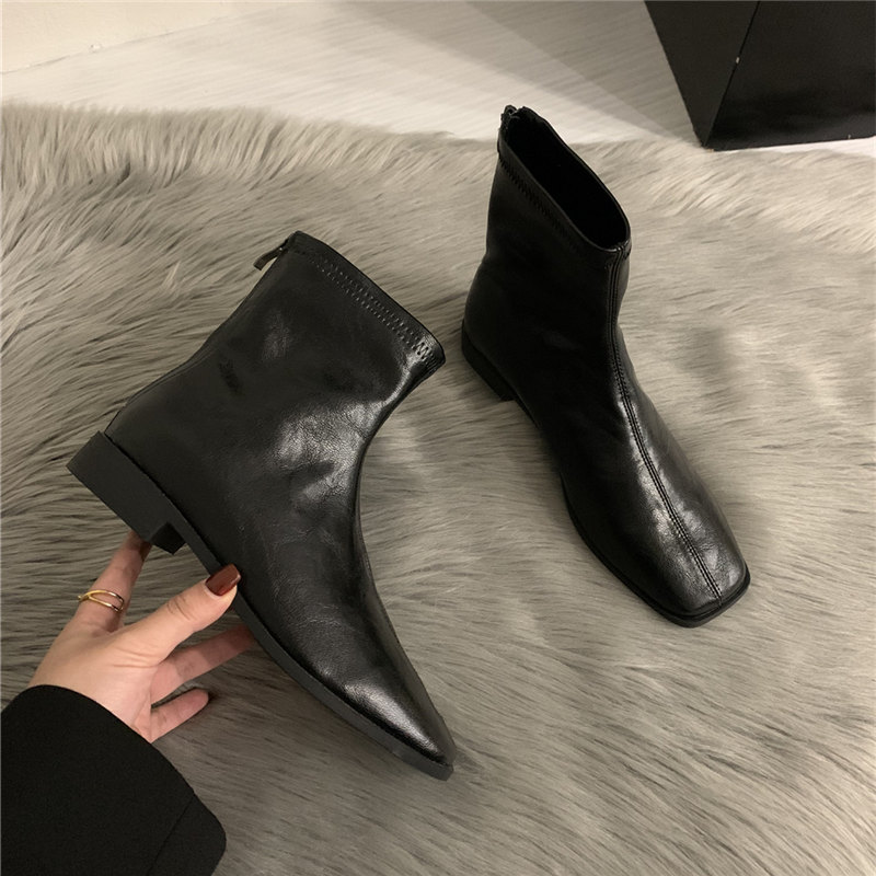 韩版 方头平底瘦瘦靴复古百搭裸靴踝靴韩国老板娘短靴 2024秋冬新款