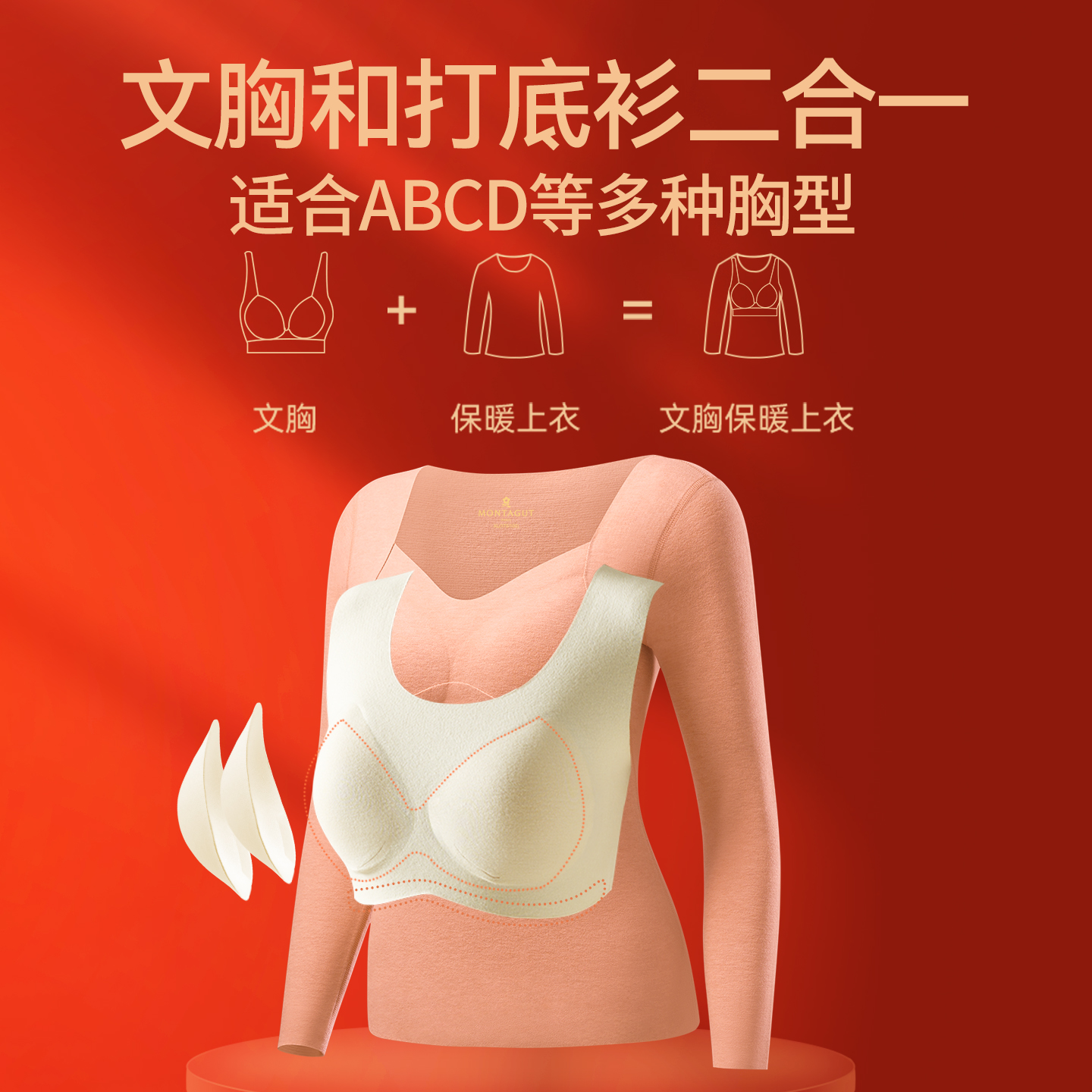 2件 梦特娇羊绒蚕丝保暖内衣女免穿文胸带胸垫秋衣上衣德绒打底衫