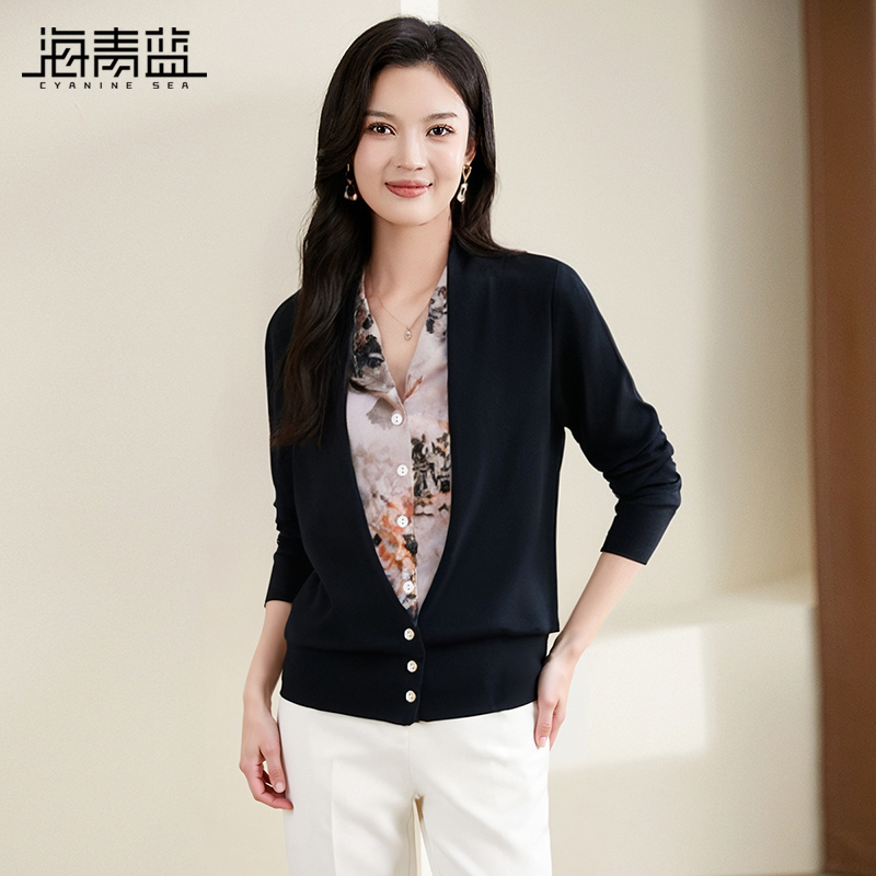 海青蓝2025秋新款 女假两件V领印花拼接气质显瘦上衣 羊毛针织开衫