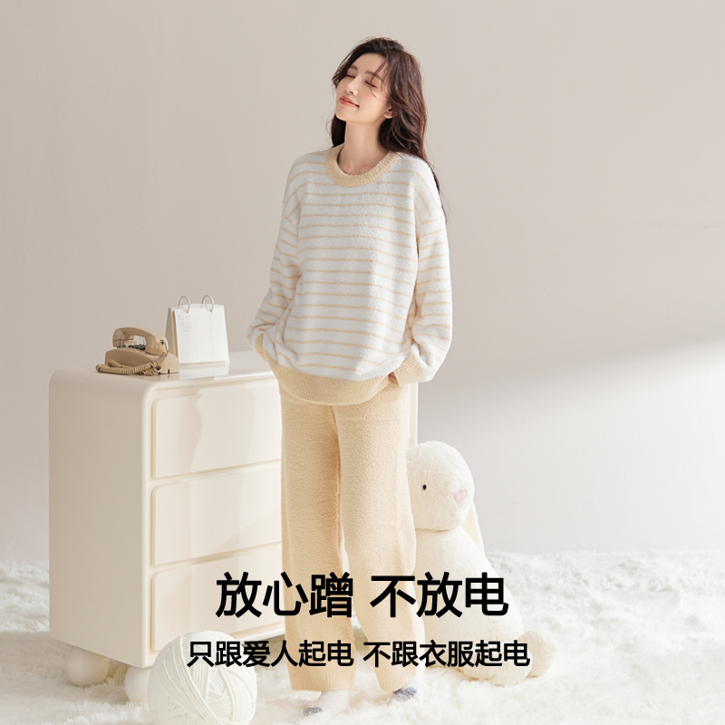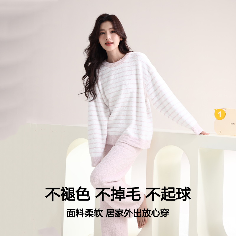 女款 猫人半边绒睡衣女秋冬款 家居服套装 珊瑚绒条纹厚冬季 2025新款