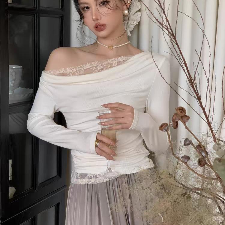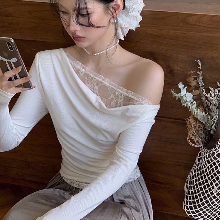 露肩辣妹风上衣 小心机修身 白色不规则拼接蕾丝露肩长袖 T恤女秋季