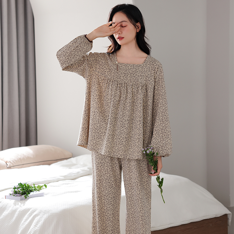 男春秋 带胸垫家居服套装 A类抗菌防螨纯棉情侣睡衣女长袖 红豆夏季