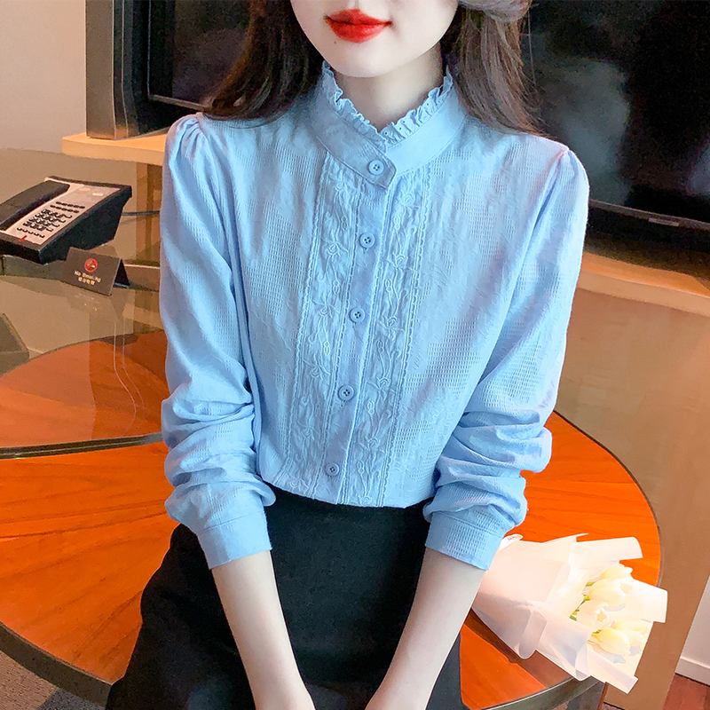 蕾丝拼接木耳领棉麻上衣别致绝美小衫 纯棉衬衫 法式 新款 女2025秋季