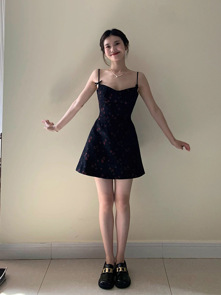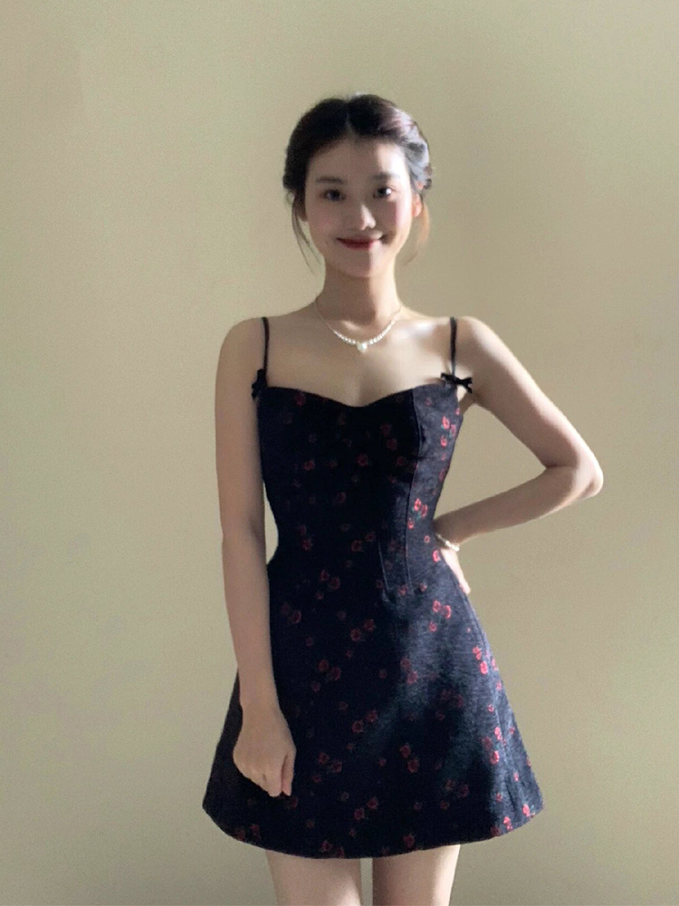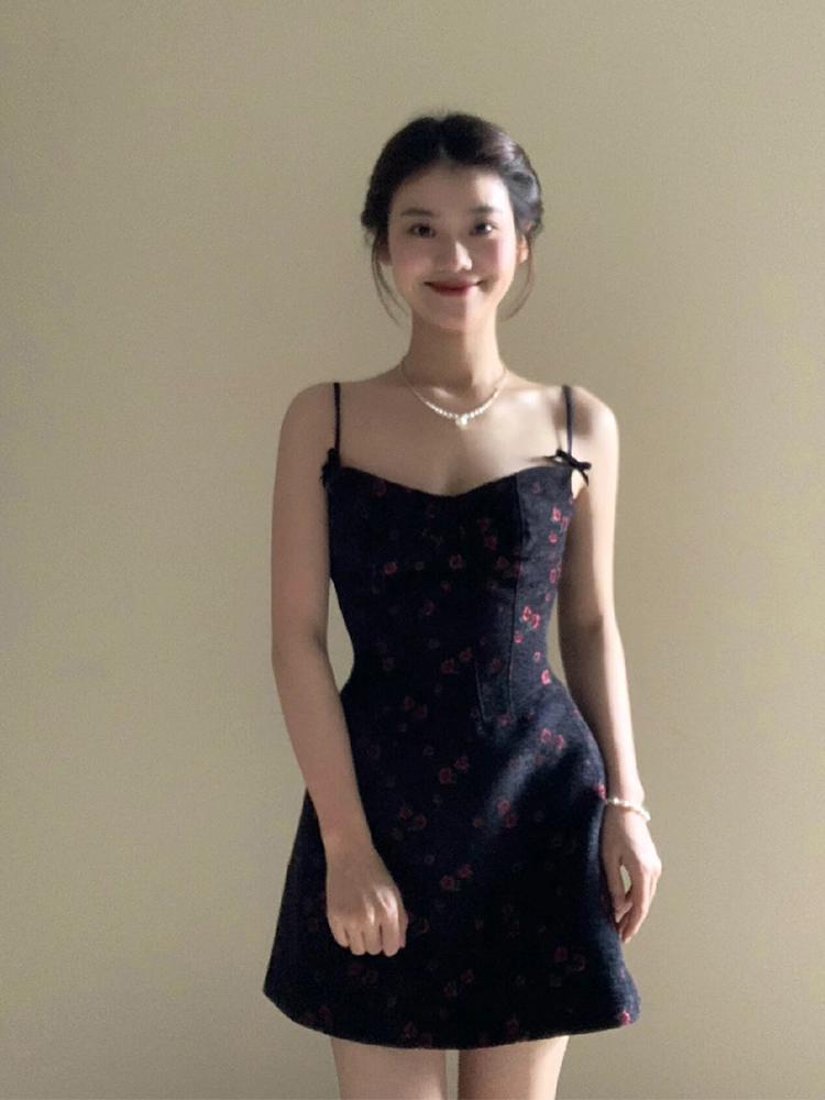 胖mm法式 甜辣妹黑色碎花吊带连衣裙女复古收腰度假风茶歇a字短裙