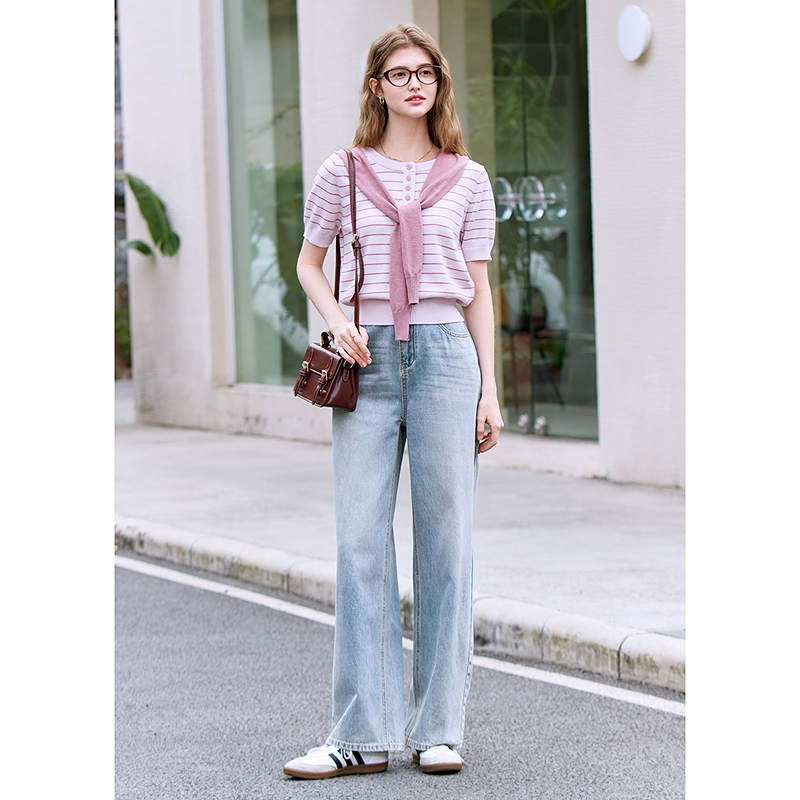 针织衫 条纹短袖 长袖 开衫 毛衣外套 RARN2025秋装 两件套圆领修身 新款
