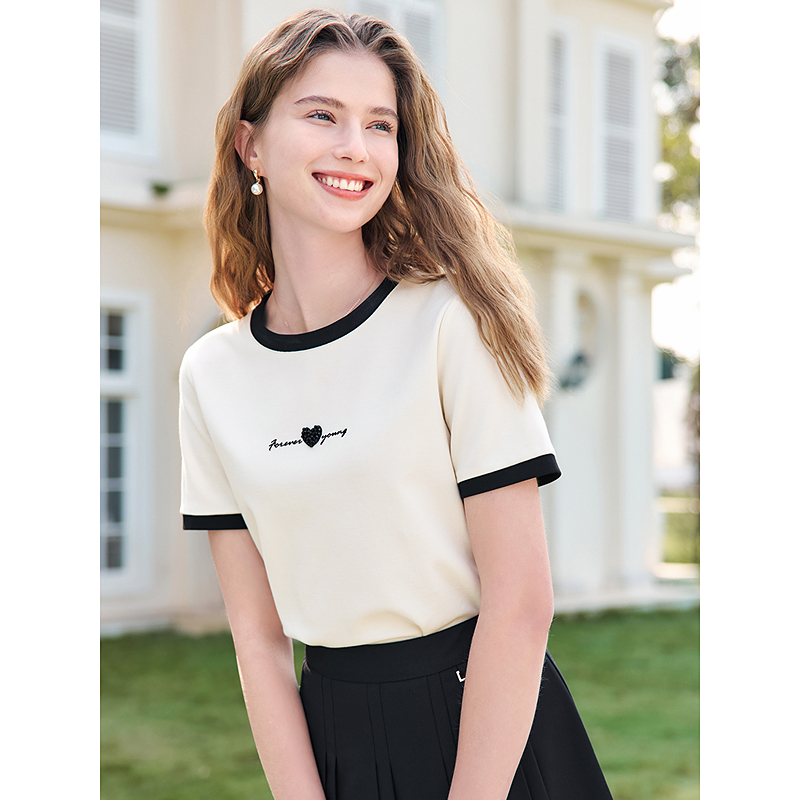 杏色心形钉珠小衫 betu百图撞色领短袖 圆领T恤女2025年春夏新款