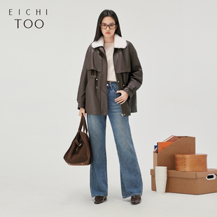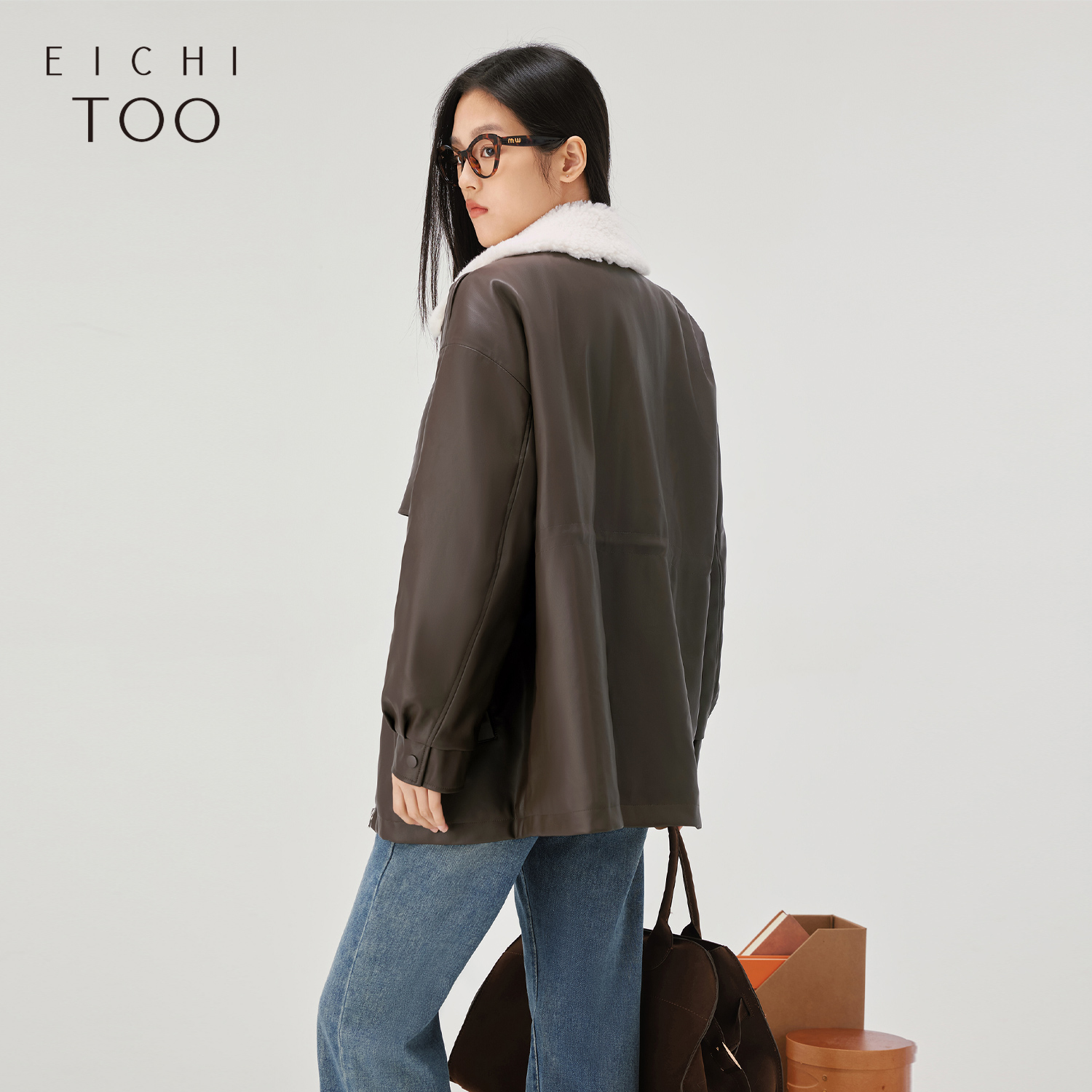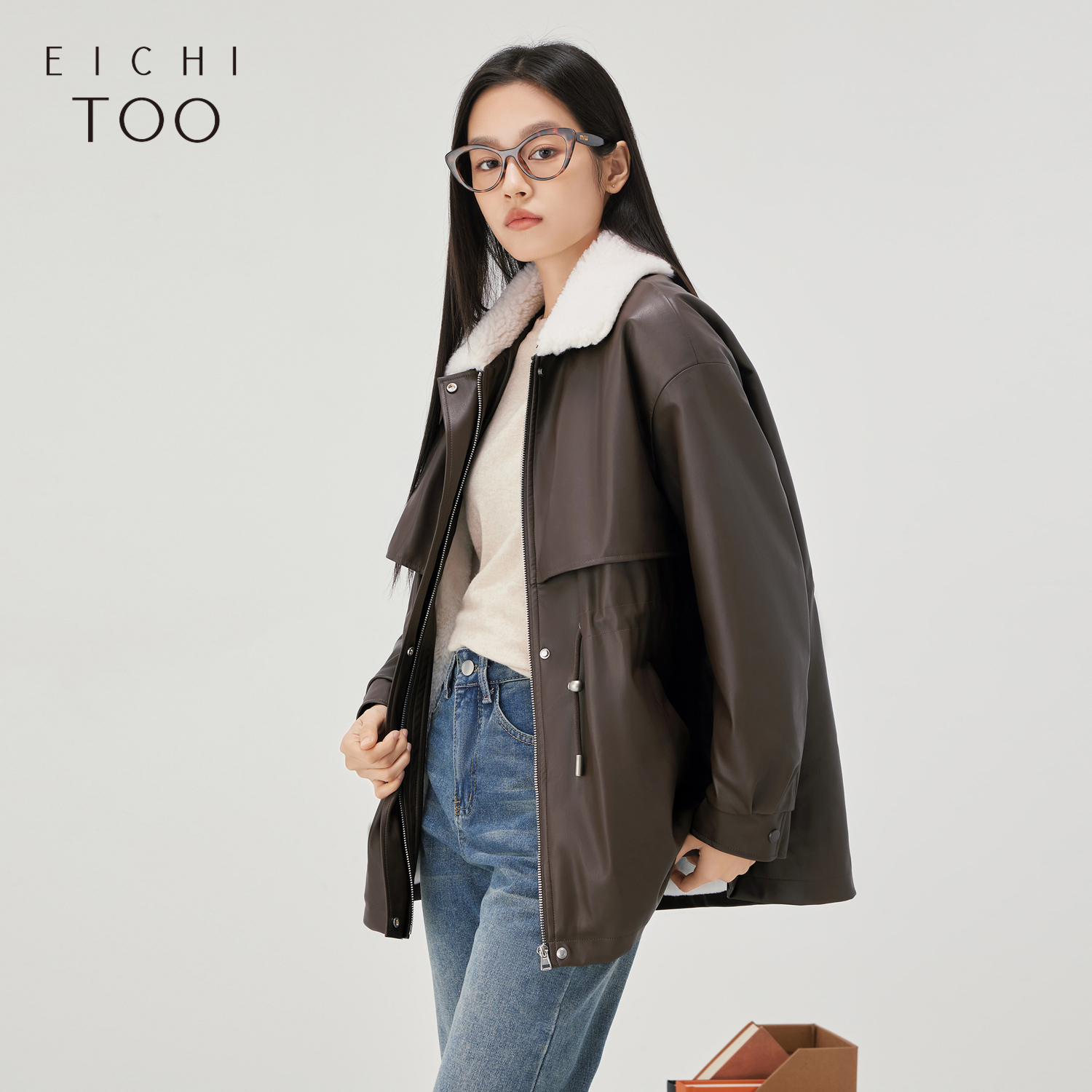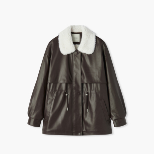 爱居兔翻领仿羊羔毛外套冬季 优雅气质PU皮大衣夹克 新款