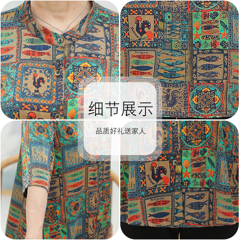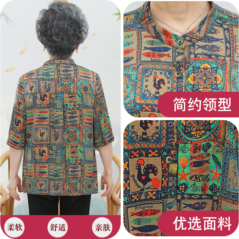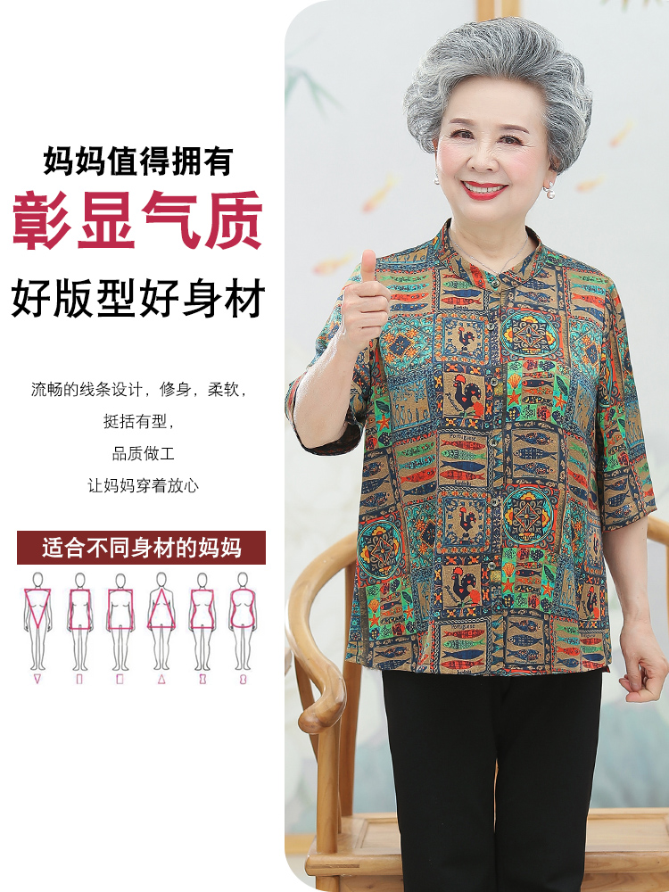 上衣 衬衣奶奶短袖 胖妈妈真丝绸缎老人衣服老年人夏装 女加肥加大码