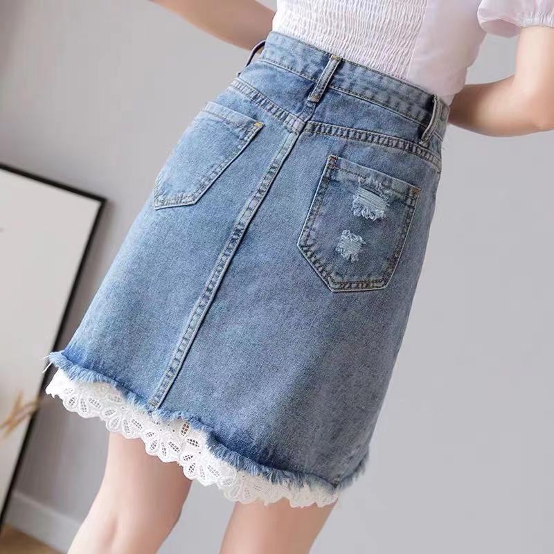 蕾丝边牛仔中裙女2025春夏新款 高腰a字裙包臀裙ins超火半身裙 韩版