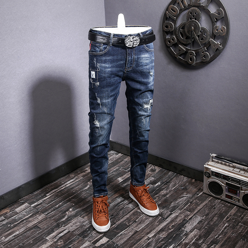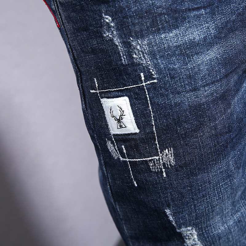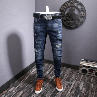 潮牌修身 春季 小脚裤 个性 子男潮 破洞补丁男牛仔裤 刮烂百搭长裤 新款
