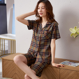 薄款 短裤 2025新款 开衫 圆人睡衣女夏季 春夏格子家居服套装 纯棉短袖