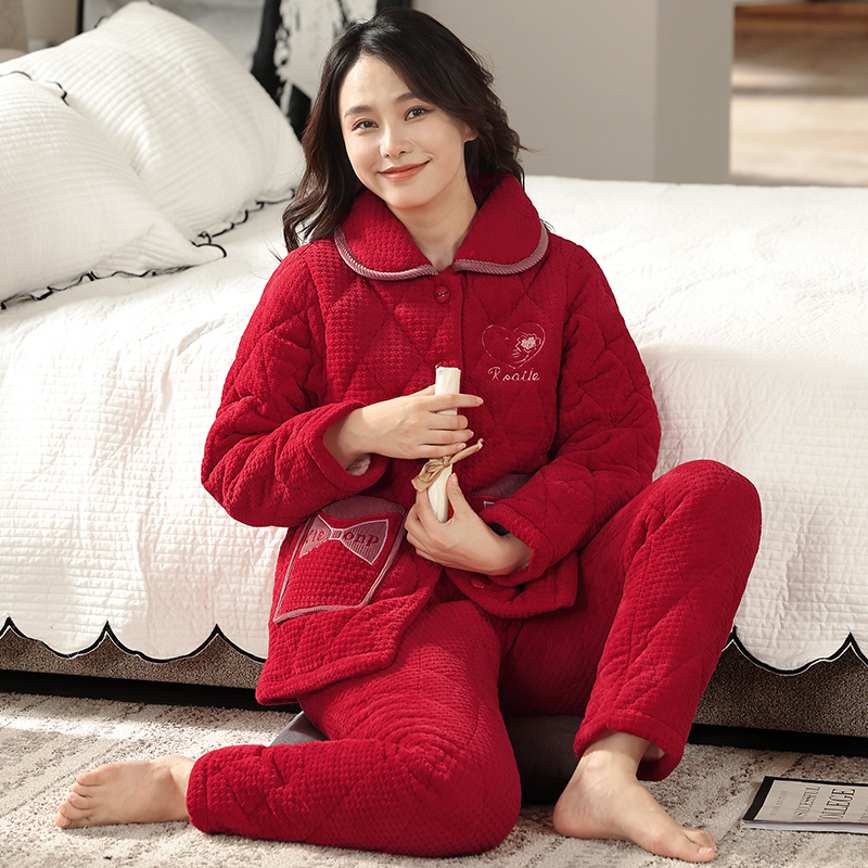 睡衣女秋冬季 珊瑚绒红色本命年冬天家居服 加厚加绒法兰绒夹棉冬款