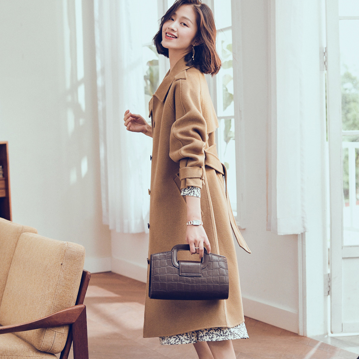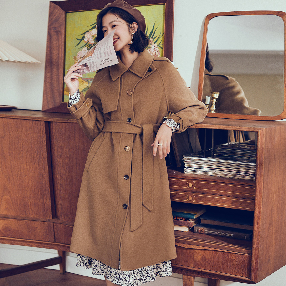 POPCHRIO欧可芮 羊毛外套女 驼绒大翻领双面毛呢呢子大衣中长短款