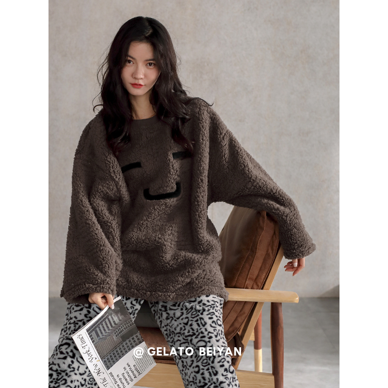 套装 学生保暖豹纹裤 加厚羊羔绒家居服大码 贝妍珊瑚绒睡衣女秋冬季