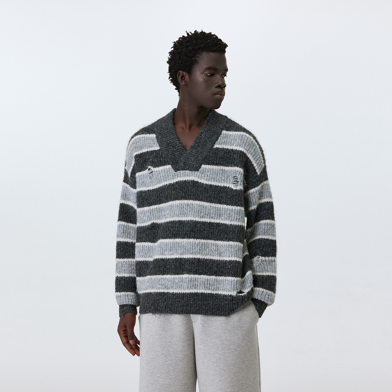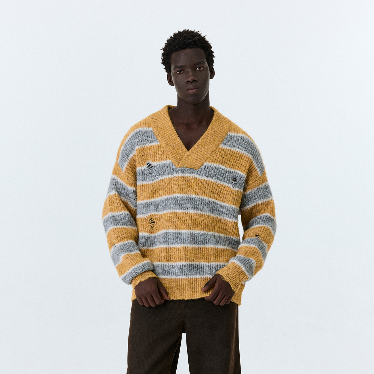设计感美式 新款 复古慵懒风套头上衣女 条纹v领毛衣男士 ATRY秋冬季