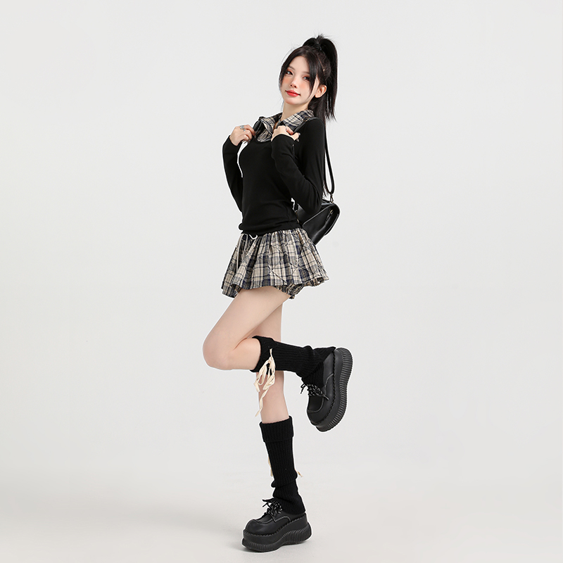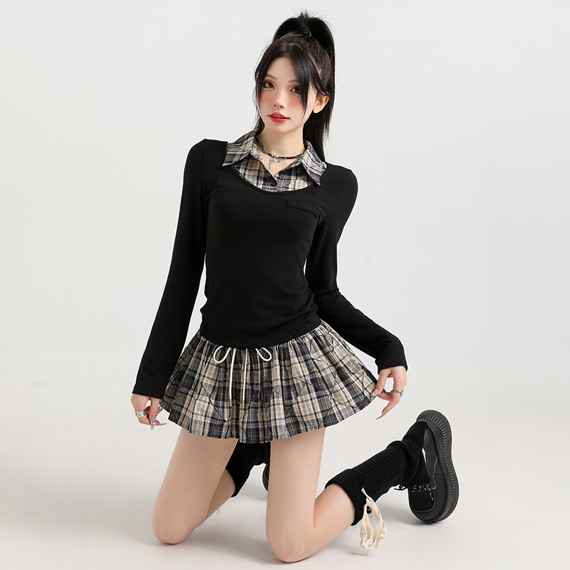 领甜辣套装 秋冬新款 衬衫 纹两件套长袖 连衣裙半身裙上衣女 学院风格