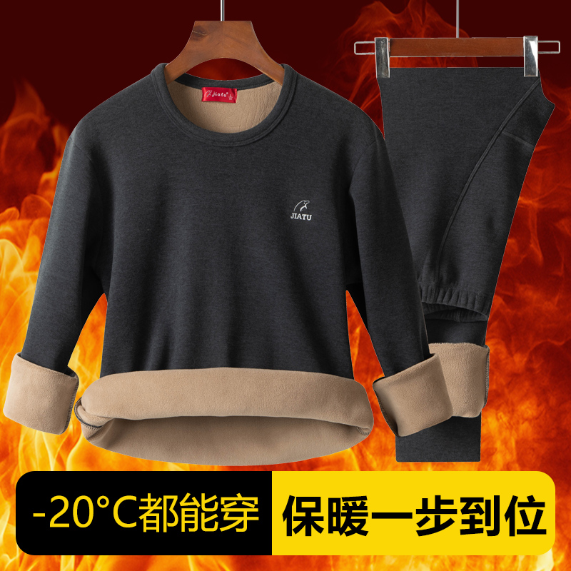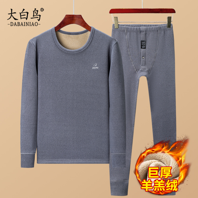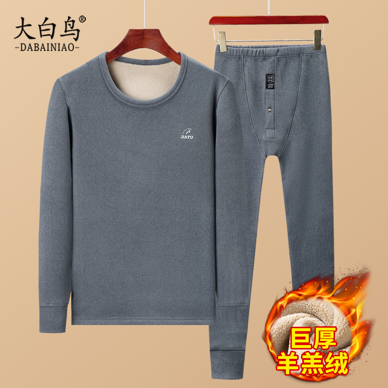 超厚羊羔绒保暖内衣男中老年人爸爸加绒加厚套装 抗寒内搭圆领 冬季