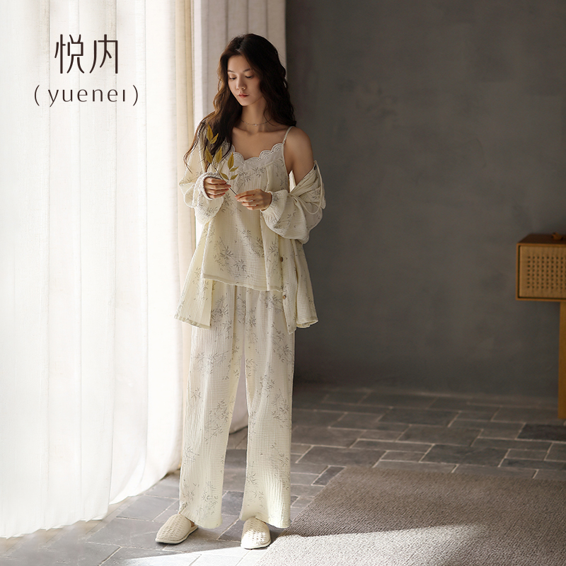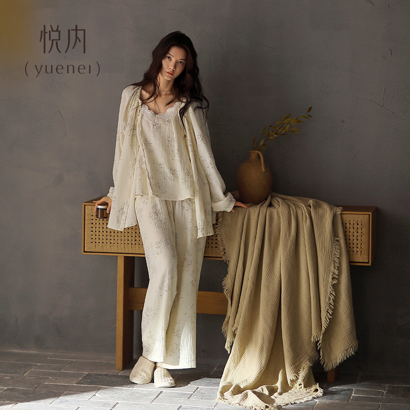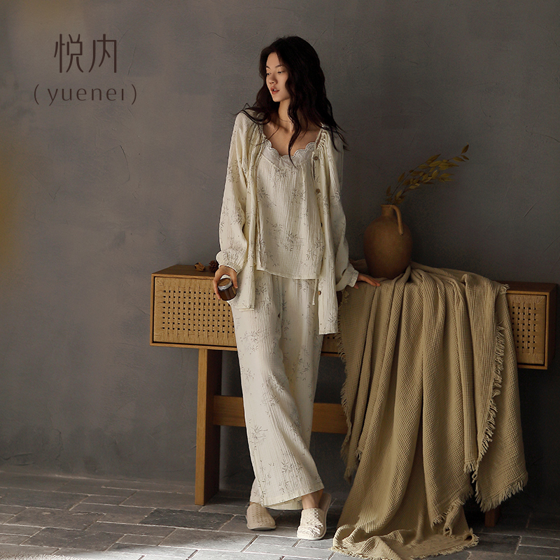 三件套装 悦内带胸垫睡衣女春秋款 家居服薄款 纯棉全棉纱布长袖 秋季