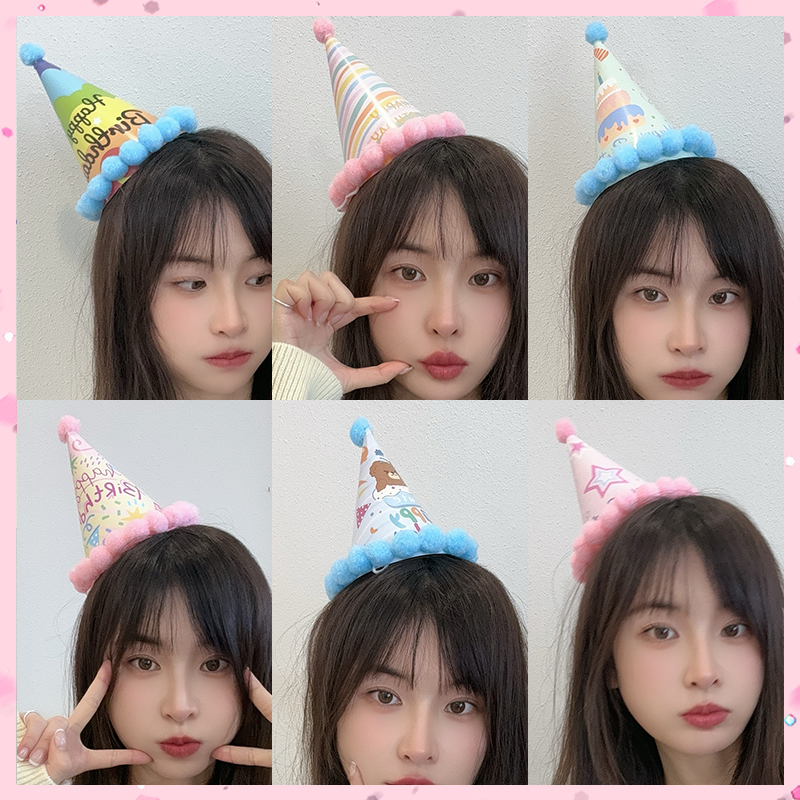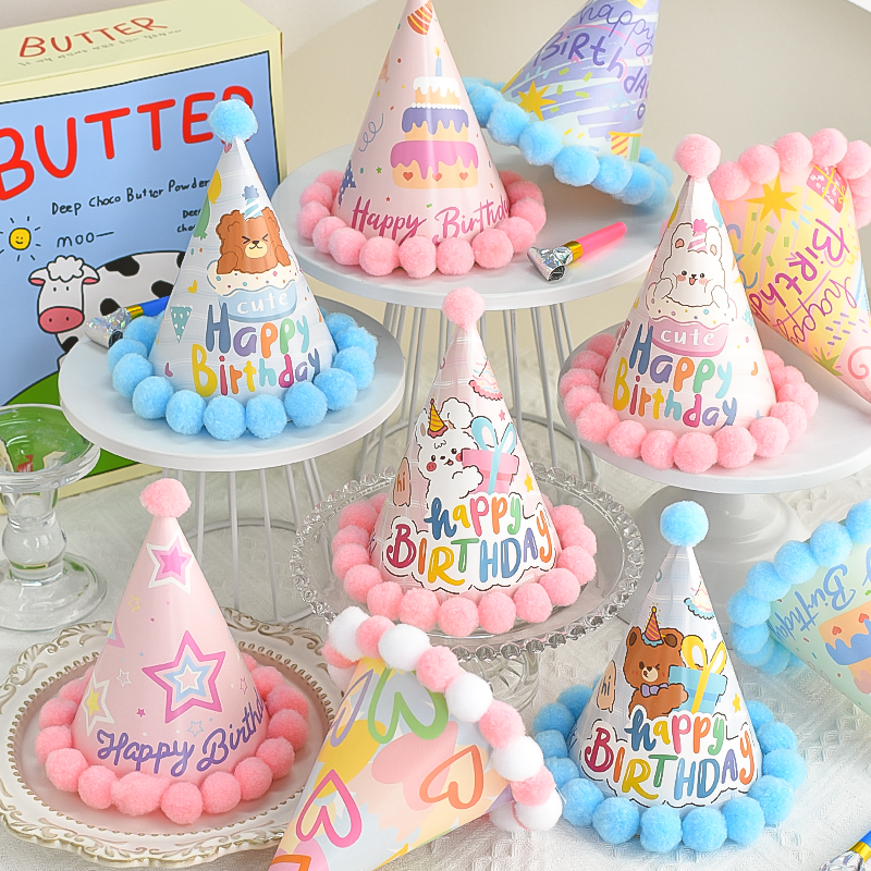 毛球生日帽派对装 饰成人儿童宝宝周岁网红卡通尖角帽彩虹绒球帽子