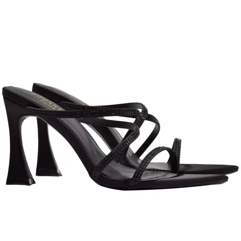 凉拖女 外穿尖头细带水钻马蹄跟高跟鞋 黑色交叉带高跟凉鞋 女夏新款