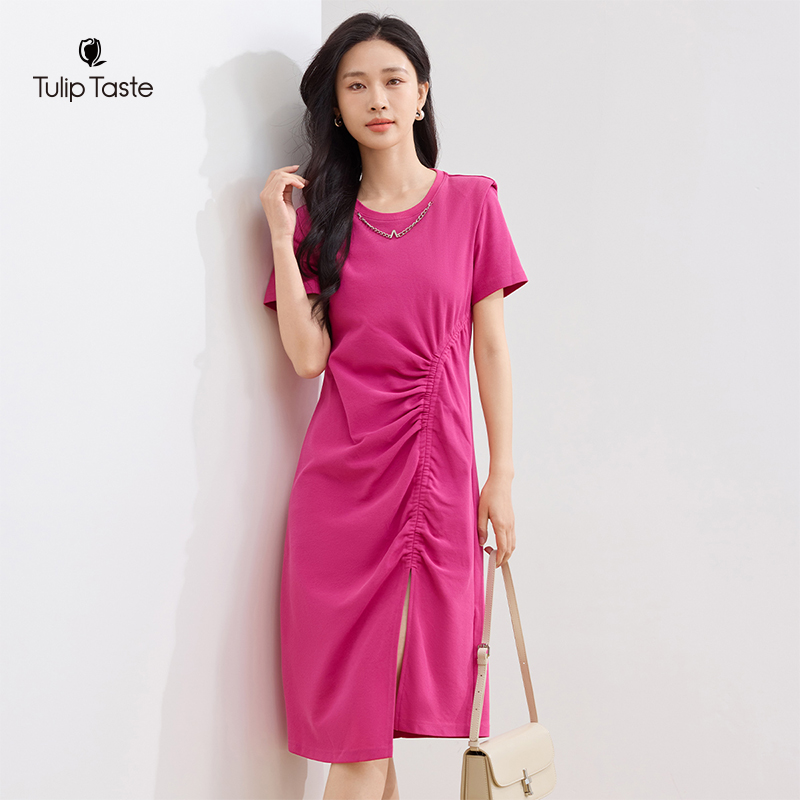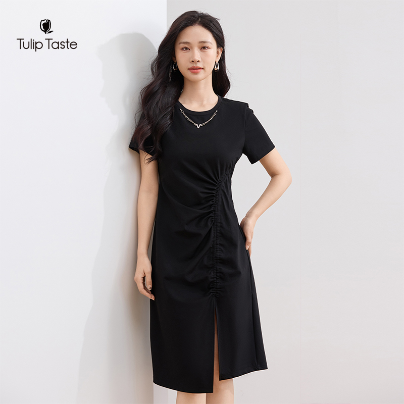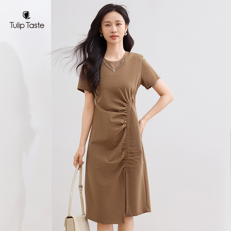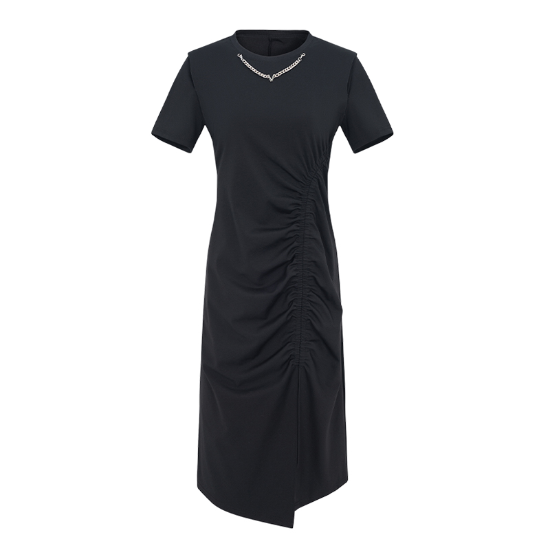 OCHIRLY欧时力 天丝不对称褶饰针织连衣裙收腰长裙2025秋冬新品