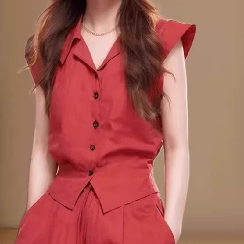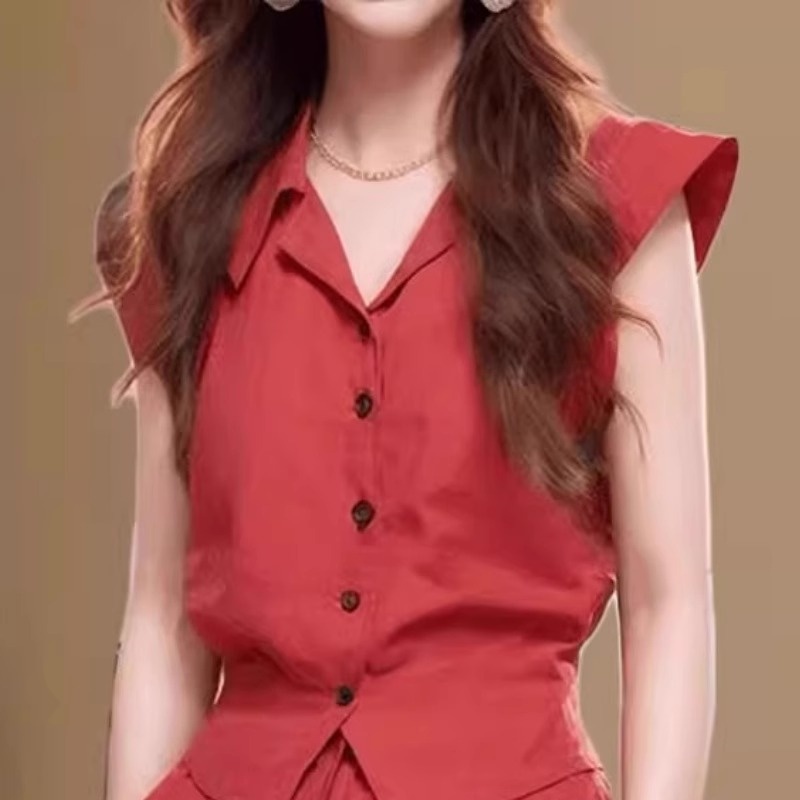 女夏装 风情万种盐系轻熟红色飞袖 两件套装 短裤 搭配一整套 衬衫