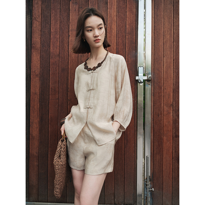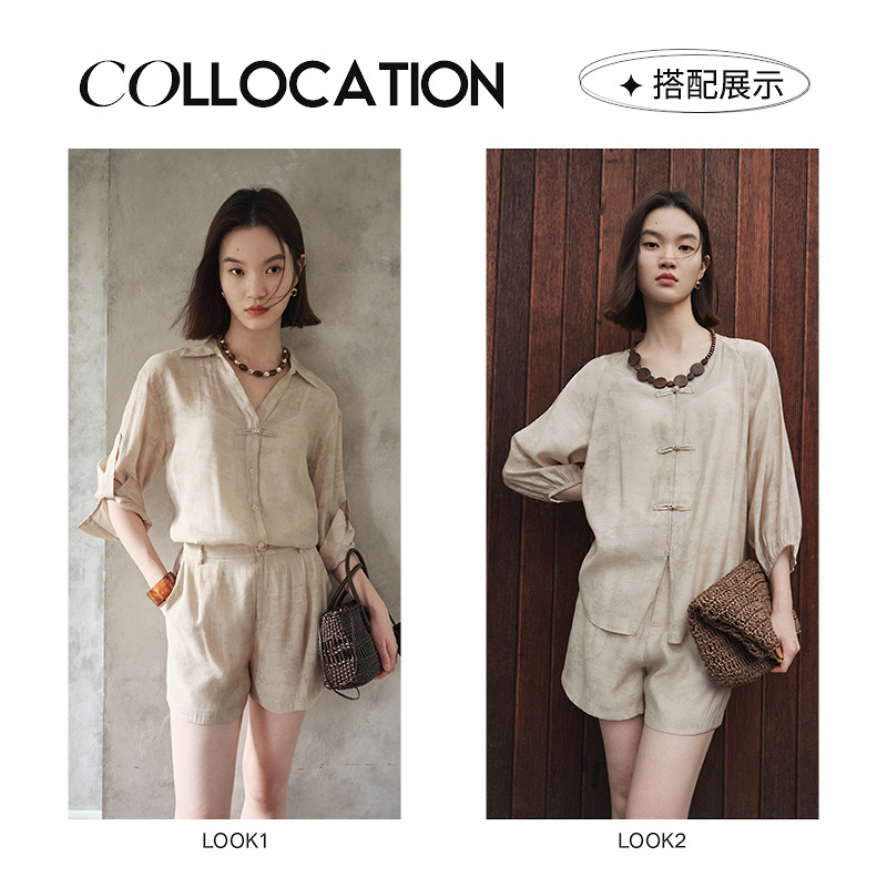女MOFAN摩凡2025夏新款 衬衫 国风卡其色休闲衬衣 盘扣七分袖 新中式