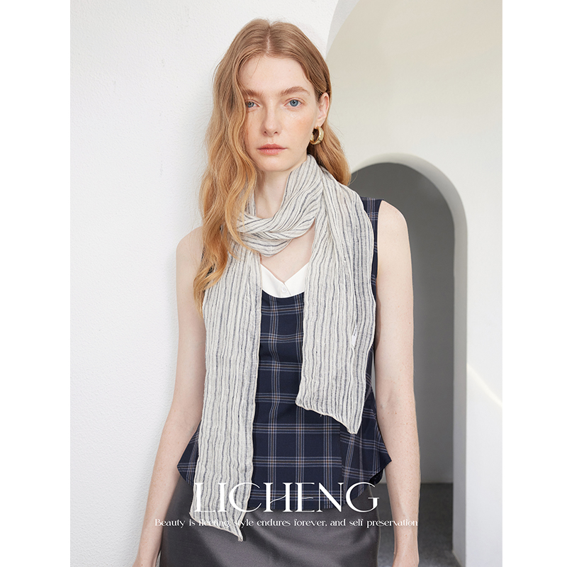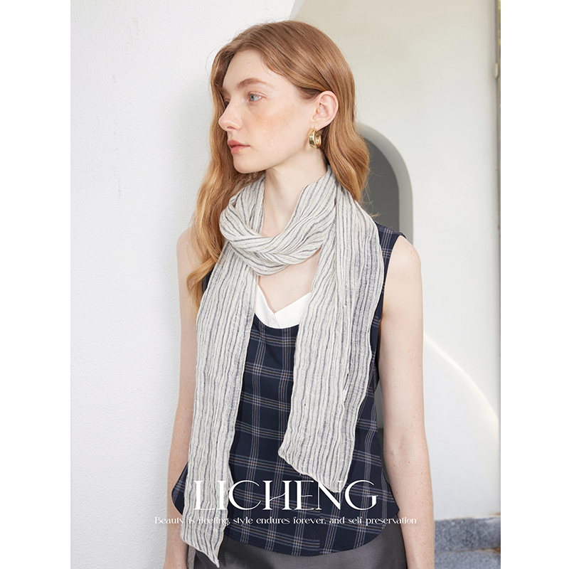 细长围巾小众韩系百搭领巾 日系条纹薄款 礼诚 100%纯亚麻丝巾夏季