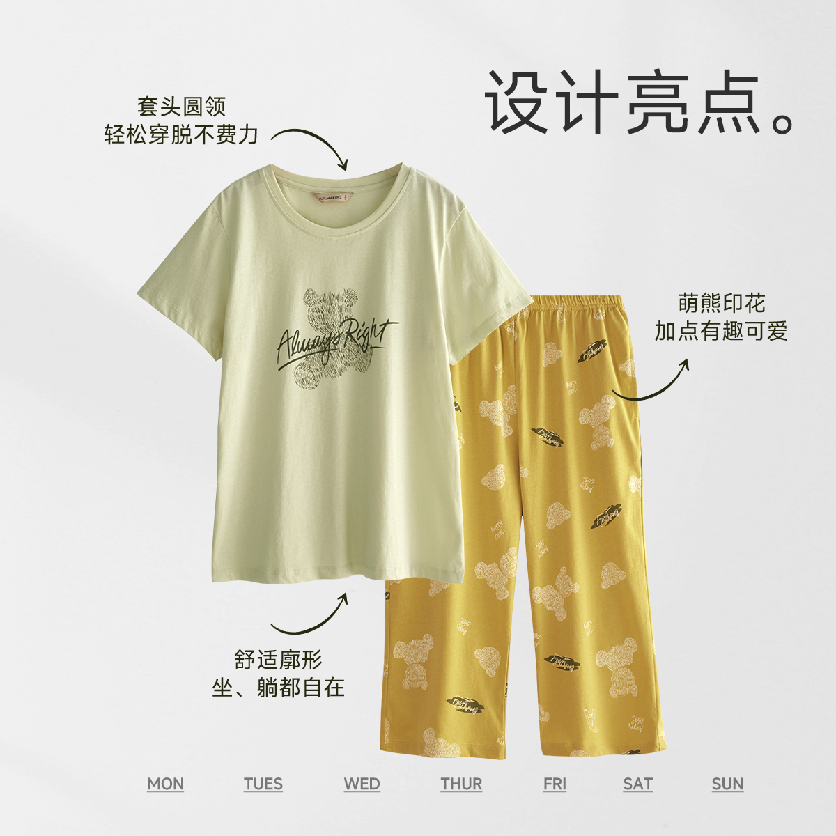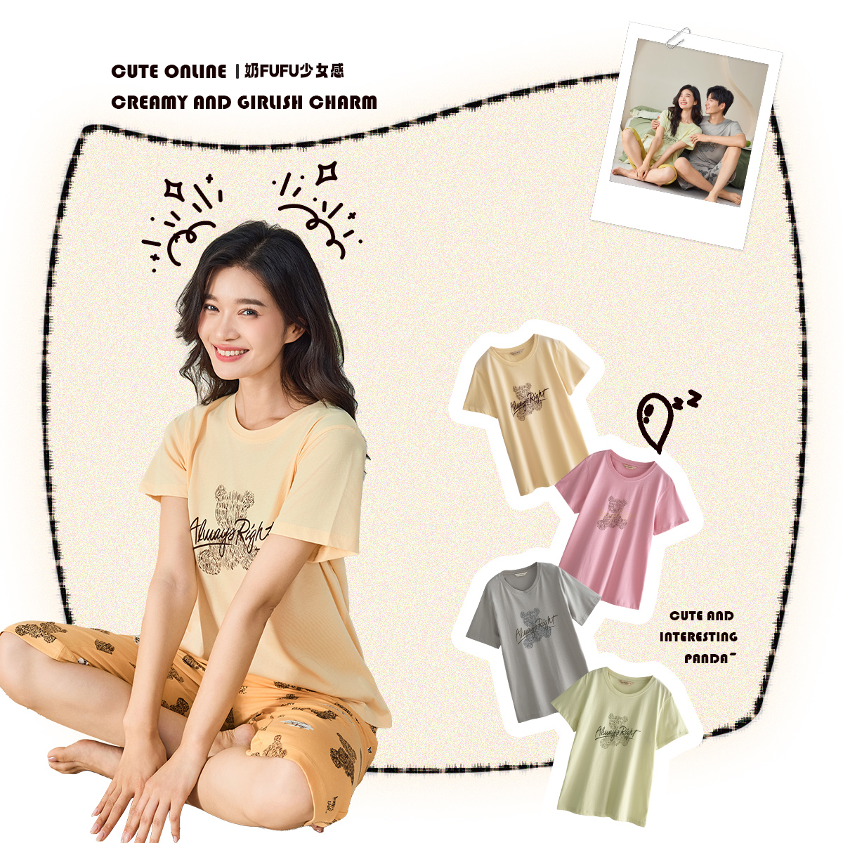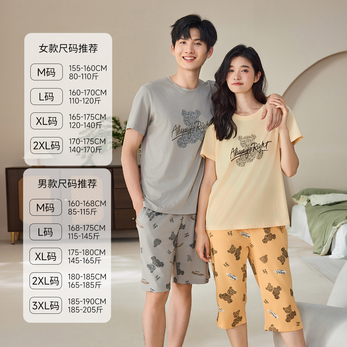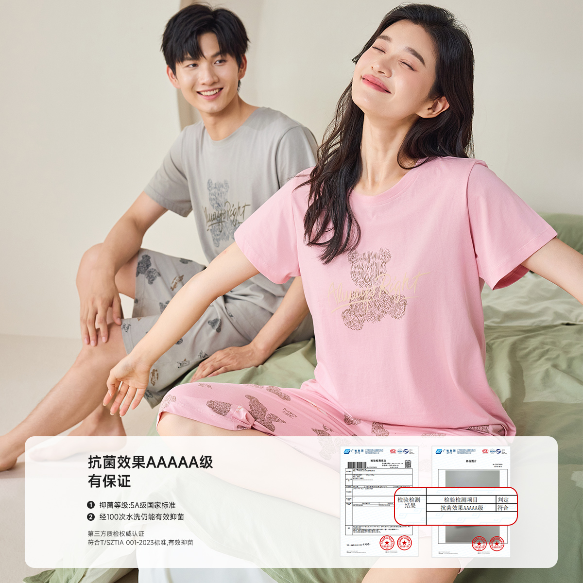 家居服 短袖 秋鹿可爱小熊字母印花柔软丝滑纯棉睡衣女夏季 情侣男士