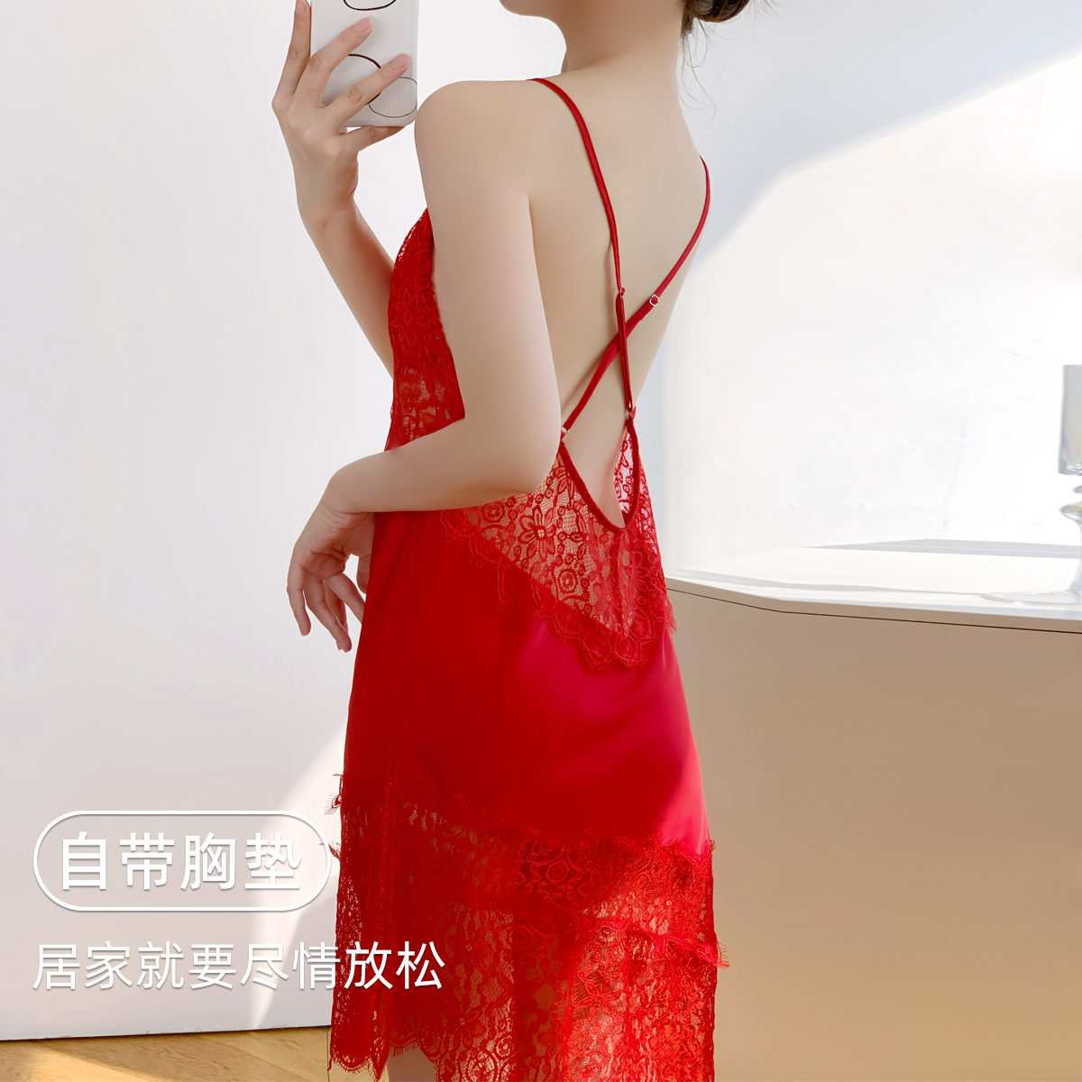 性感睡衣女2025年春夏季 纯欲风冰丝绸带胸垫蕾丝吊带睡裙睡袍 新款