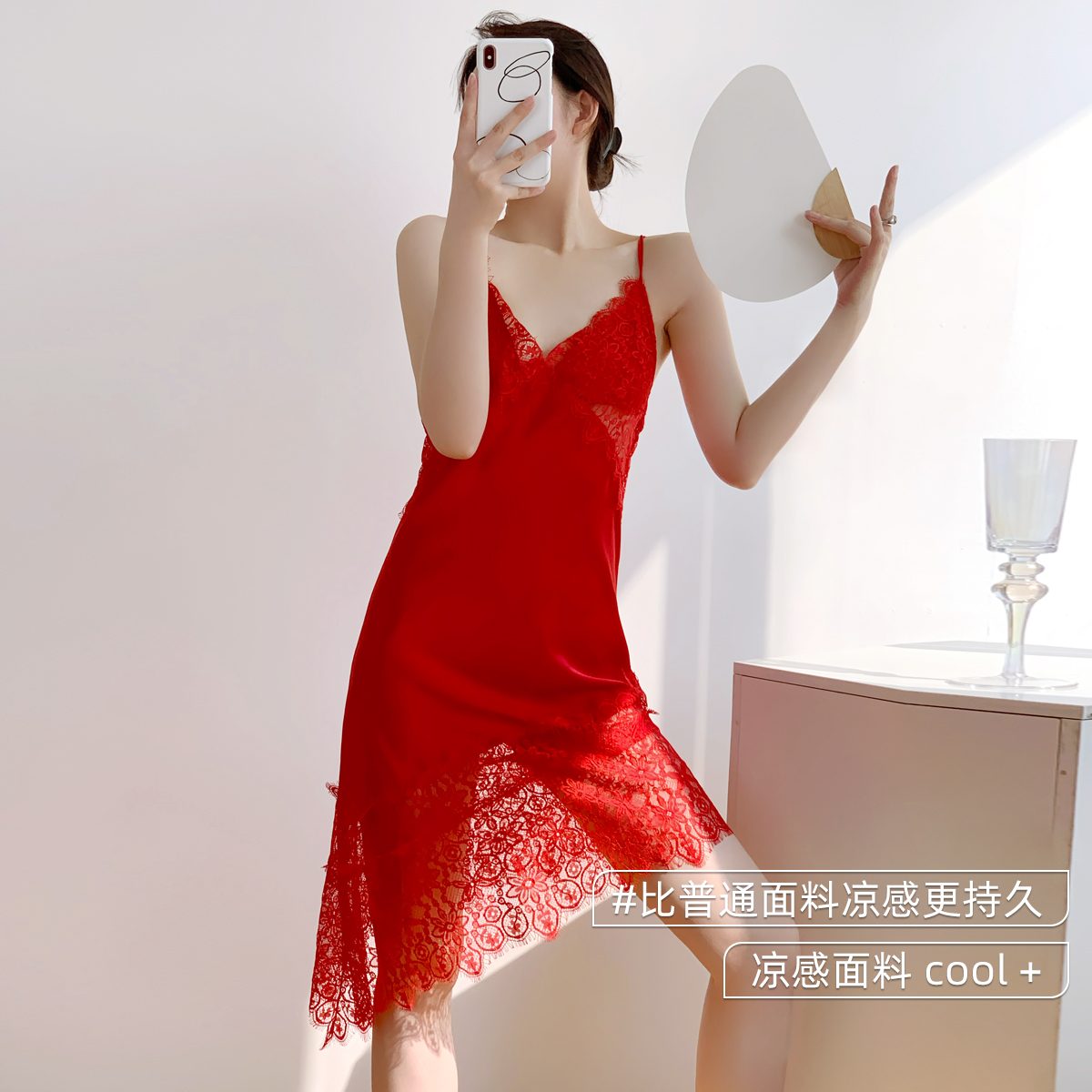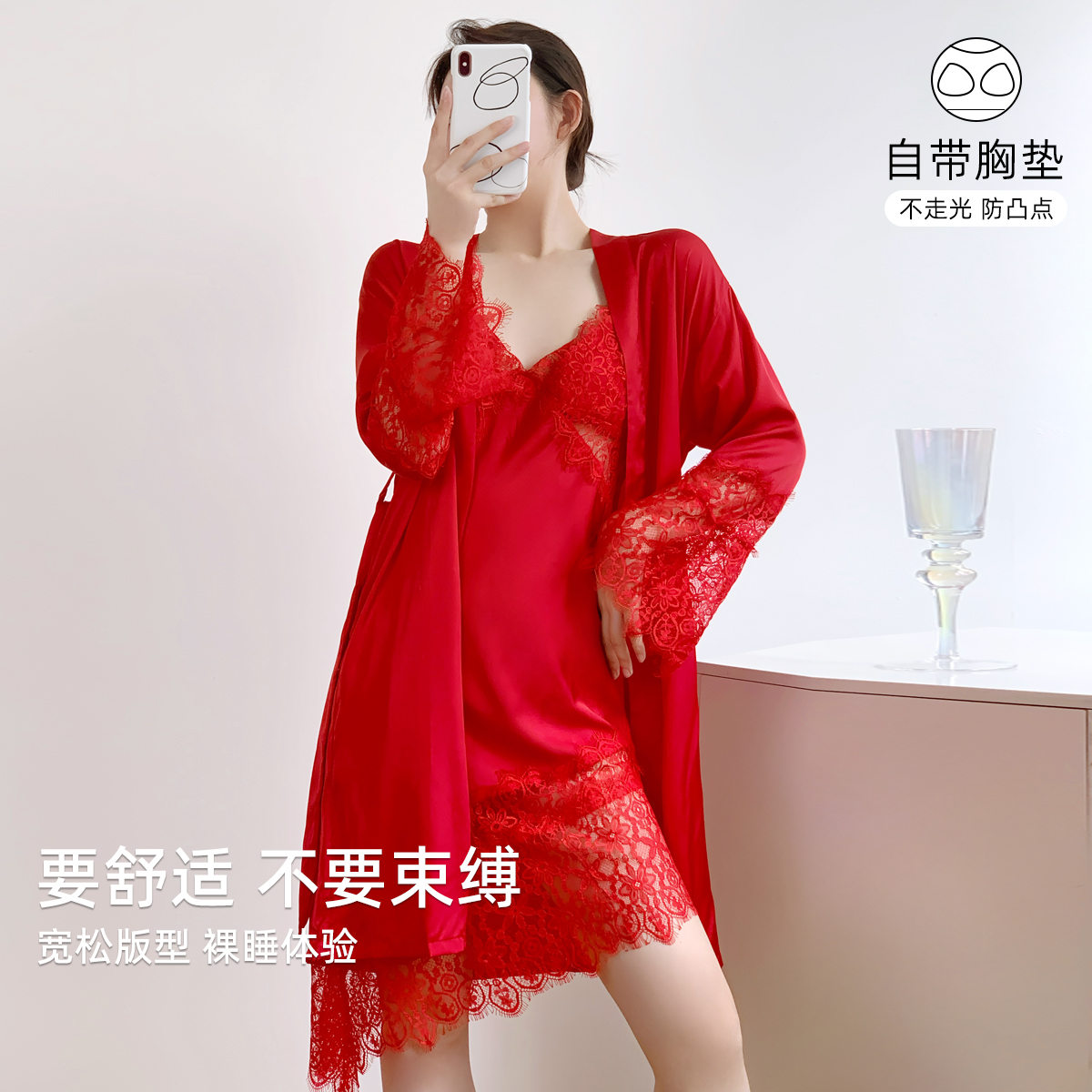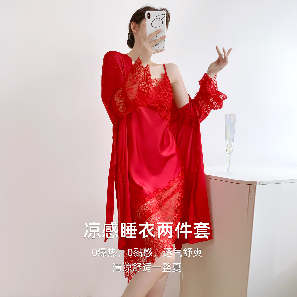2025新款 性感冰丝睡袍纯欲风高级感蕾丝吊带睡衣 睡裙女春秋夏薄款