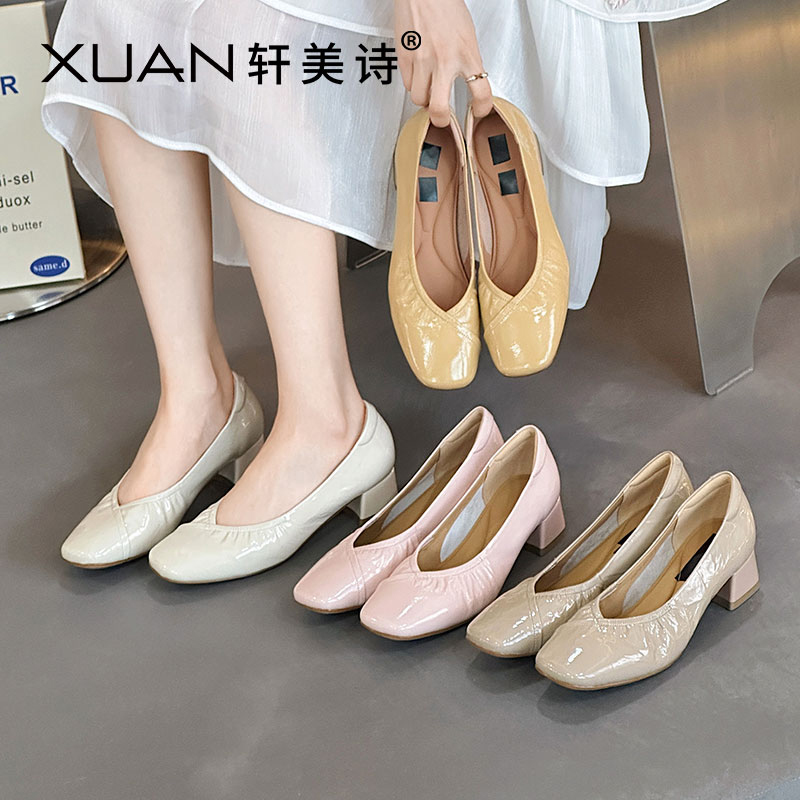 60117 舒适方跟褶皱休闲高跟鞋 轩美诗牛漆皮女浅口单鞋 2025夏新款